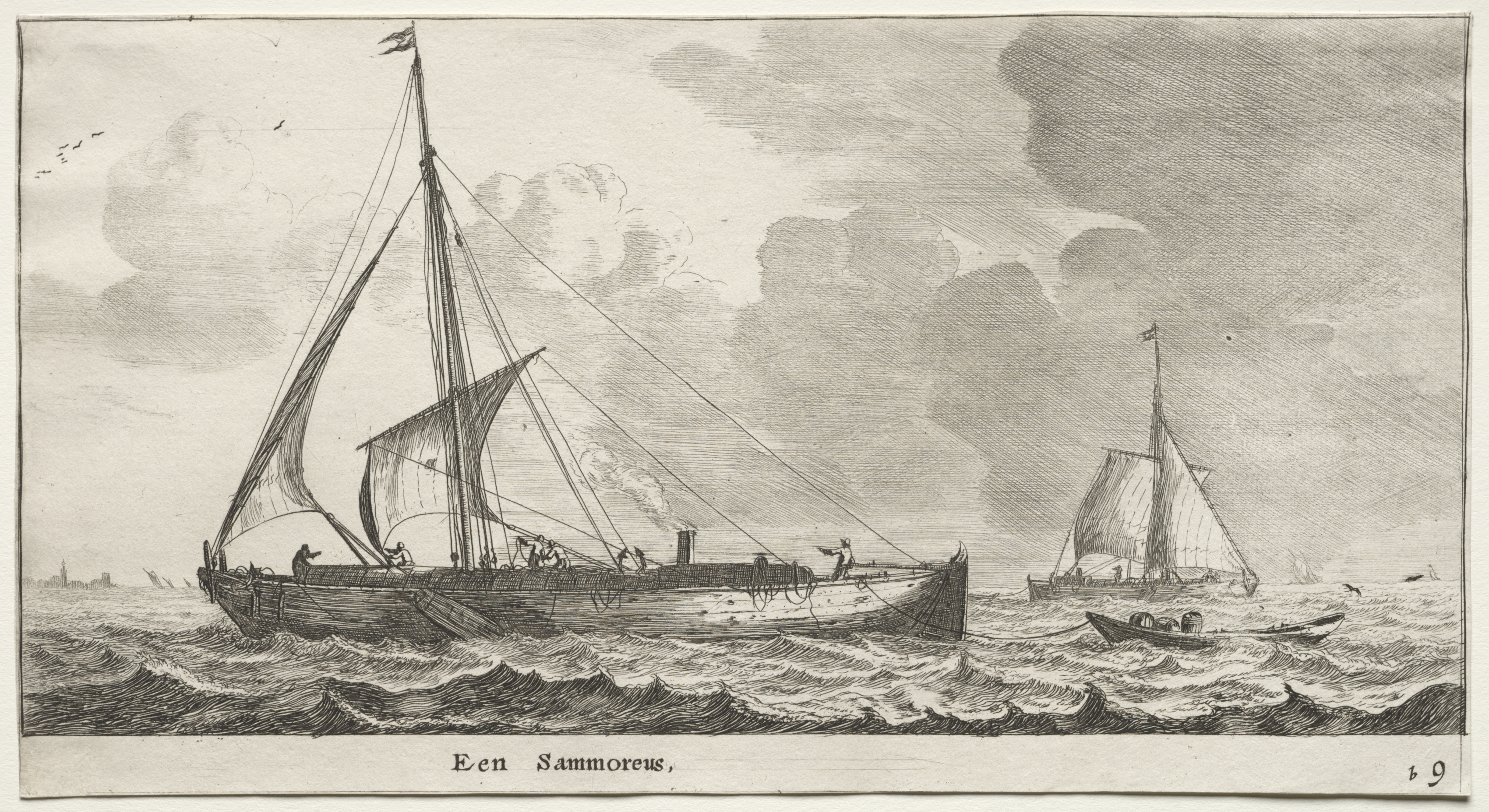 Black and white image of ships on a body of water. The largest ship has three sails up and is on the left side. The ship has a flag on top of the tallest mast. People are on the deck. The ship on the right has one sail up. There is a smaller boat in front of the ship on the right. The water is choppy. The dark clouds in the sky are thick and fluffy. The words "Een Samoreus" are written at the bottom of the image. The number "9" is written in the bottom right corner.