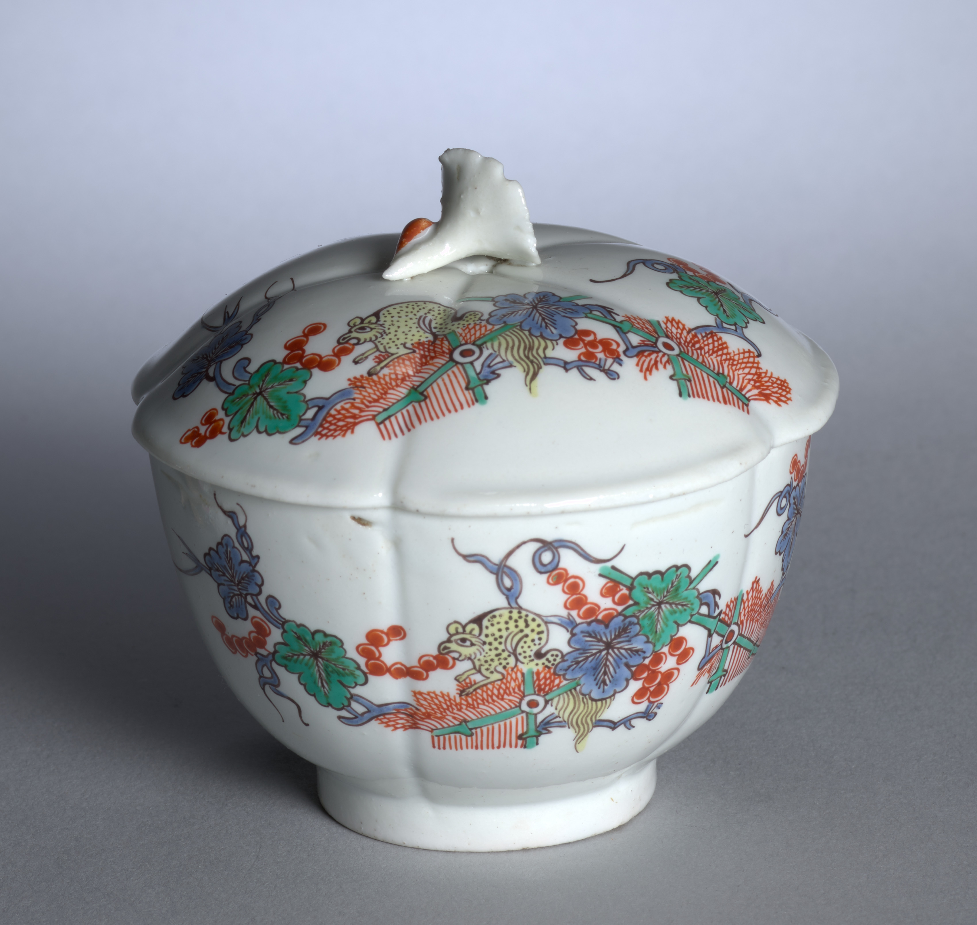 White porcelain sugar bowl with a rounded body and a short foot. The bowl has a lid with a small handle on top that resembles a leaf. The bowl and lid are decorated with a colorful design featuring a leopard-like animal, red berries, blue flowers, green leaves, and red and green bamboo-like patterns. The background of the image is grey, with the bowl casting a shadow to the left. The overall design and style suggest it is a piece of Chantilly porcelain.