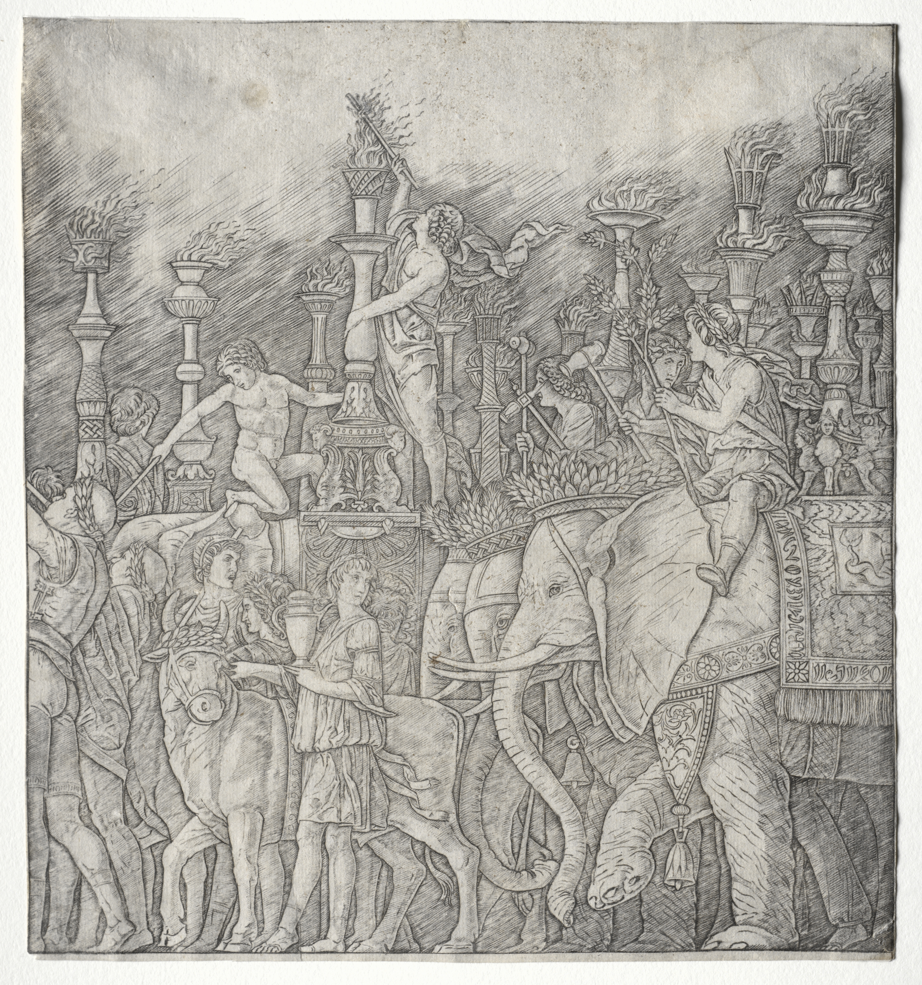 The Triumphs of Caesar: The Elephants by Giovanni Antonio da Brescia. Black and white drawing of a procession with three elephants walking to the right; human figures on and around the elephants; two men on the lead elephant; several torch-bearing posts around; women on the left.