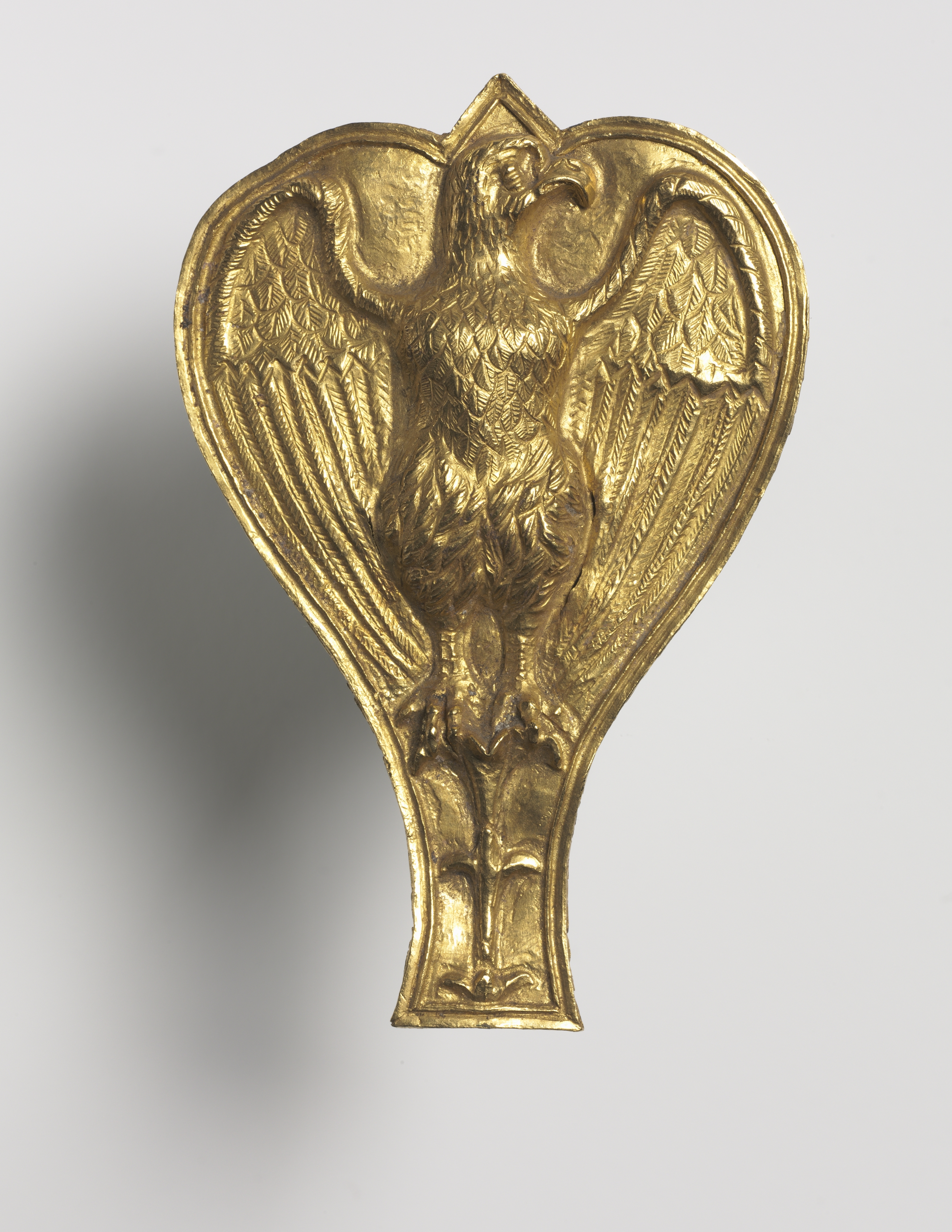 Golden ornament in the shape of an eagle. The ornament is shaped like a teardrop with a stem at the bottom. The eagle has its wings spread out to the sides and its head facing forward. The eagle's body is covered in feathers, which are depicted in intricate detail. The ornament has a raised border around the edge. The background of the image is light gray, with a shadow cast to the left of the ornament. The ornament titled "Ornament with Eagle" is by an unknown artist.