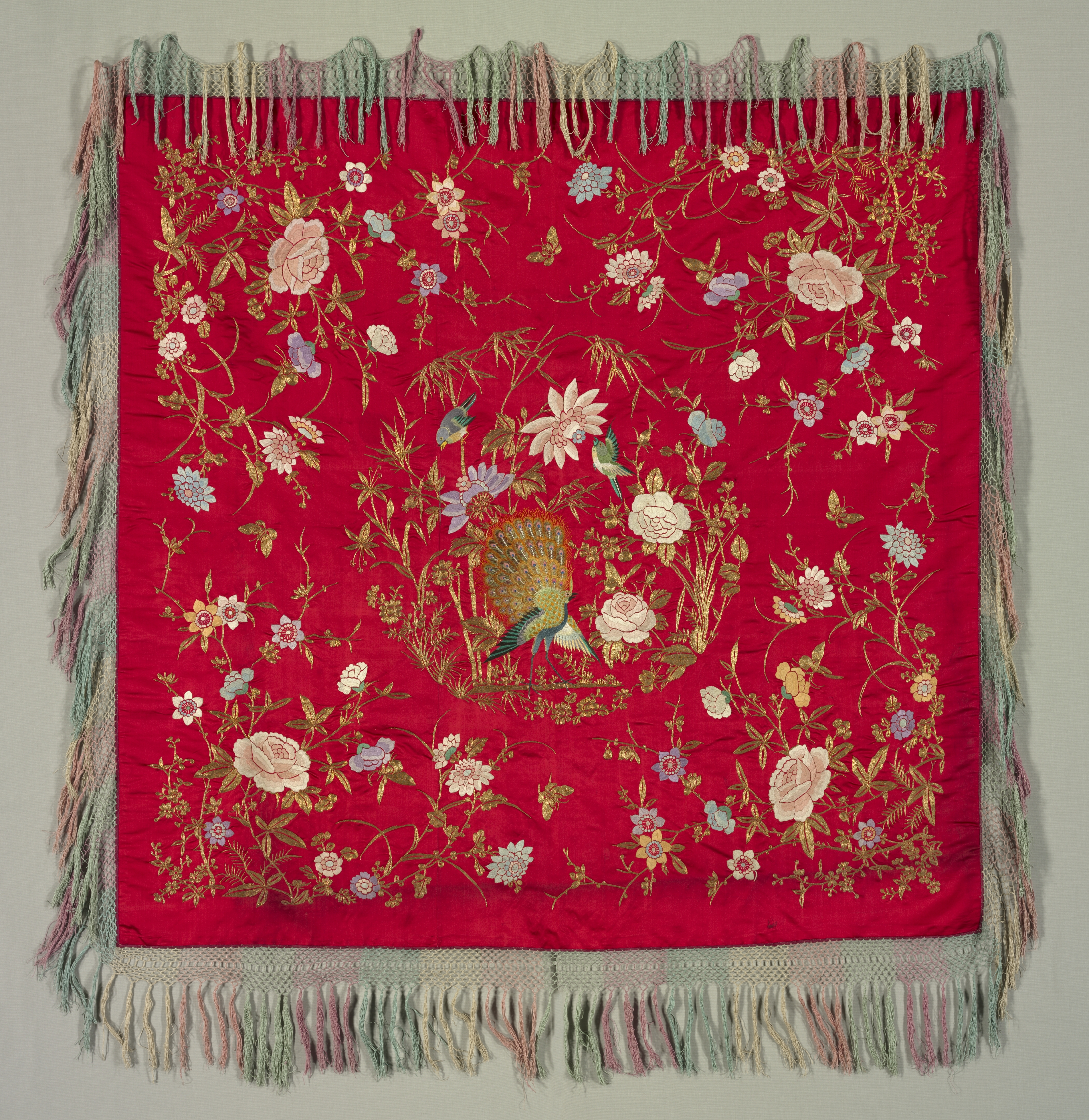 Red square tablecloth with multicolored fringe around the edges. The fringe is pastel shades of pink, blue and white. The tablecloth has embroidered flowers and a bird in the center. The flowers are white, pink, blue and purple. The bird is gold with blue tail feathers. The background of the tablecloth is solid red.
