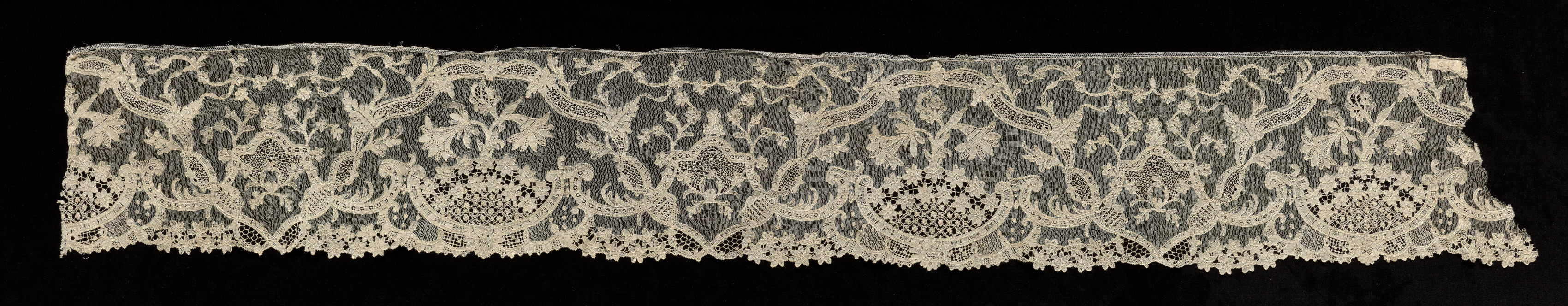 The image shows a long, rectangular piece of off-white lace on a black background. The lace features floral patterns with leaves and curved vines. The bottom edge of the lace is scalloped. The lace, titled "Needlepoint (Burano Point) Lace Flounce", has a repeating design across its width and appears to be made by artist unidentified.