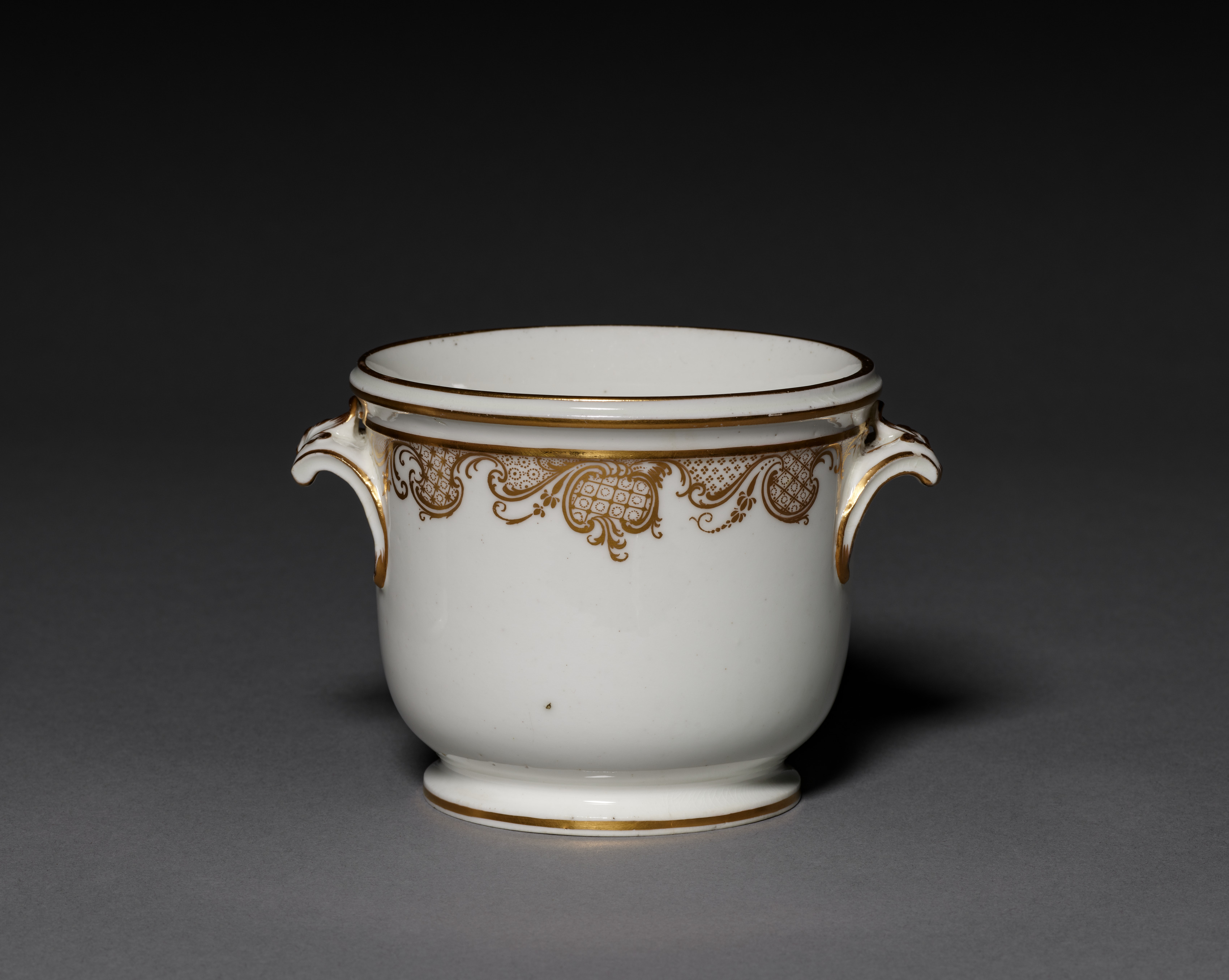 White porcelain pot with two handles, one on each side. The pot has a wide mouth and a narrow base. The handles are curved and have a gold trim. There is a gold design around the top of the pot, consisting of intricate patterns and shapes. The pot sits on a gray surface, with a dark background. The pot is titled "Flower Pot (2 of 2)" and is made by the Vincennes Porcelain Factory.
