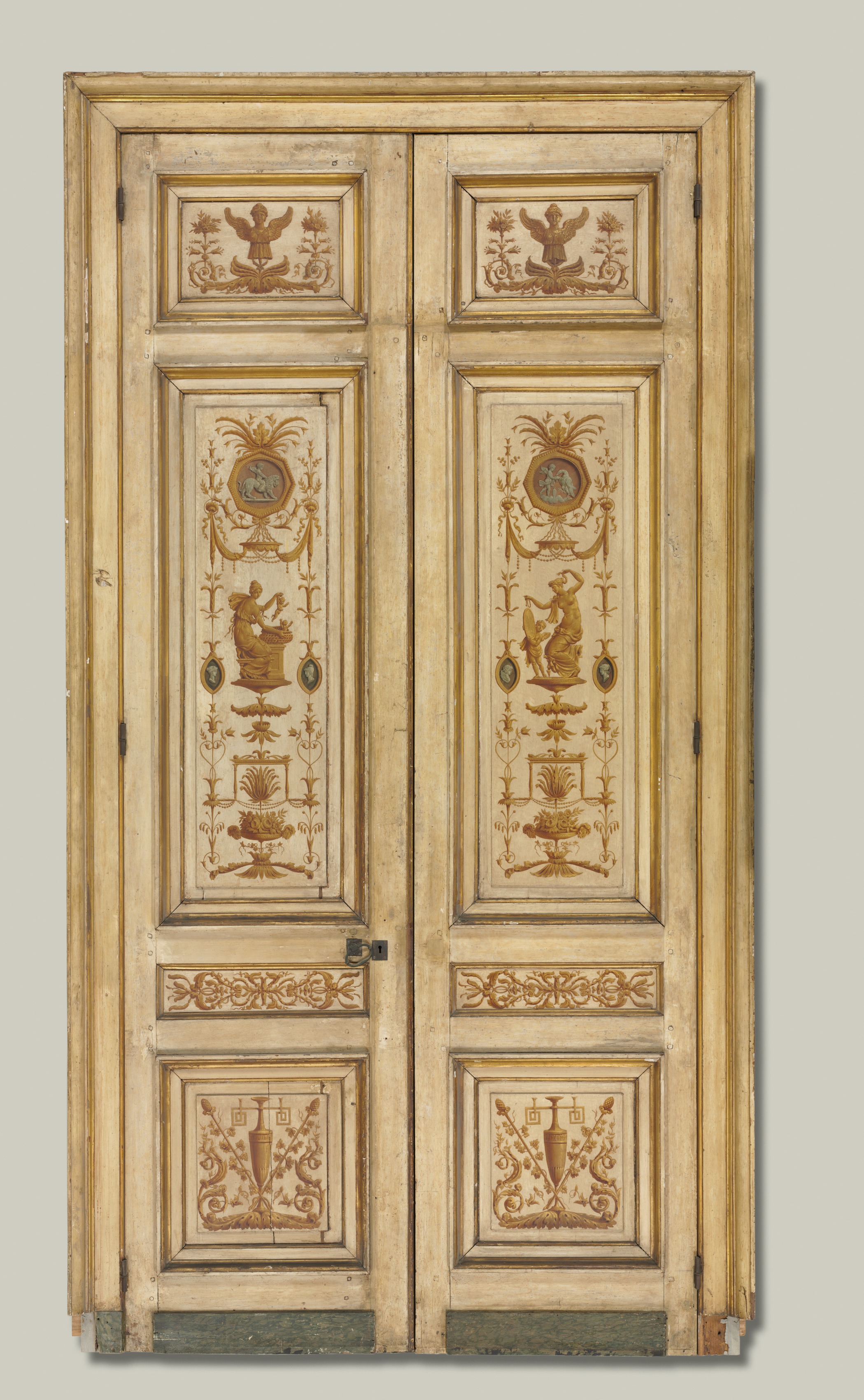 Overdoor Painting by Pierre Rousseau. The image shows a pair of old, wooden doors with a light-colored finish, likely painted or varnished. The doors are divided into multiple panels. The top and bottom panels on each door feature square designs. The two central panels on each door are long and rectangular. Each panel contains various painted designs in shades of brown and gold, including people, plants, urns, and other objects. The panels on the left door feature a figure in a vase-like object at the top and a figure with a vessel at the bottom. The panels on the right door feature a figure underneath a canopy at the top and a figure holding an object at the bottom. The doors have a latch or lock on the left door. The background of the image is a solid color, likely a wall or backdrop.