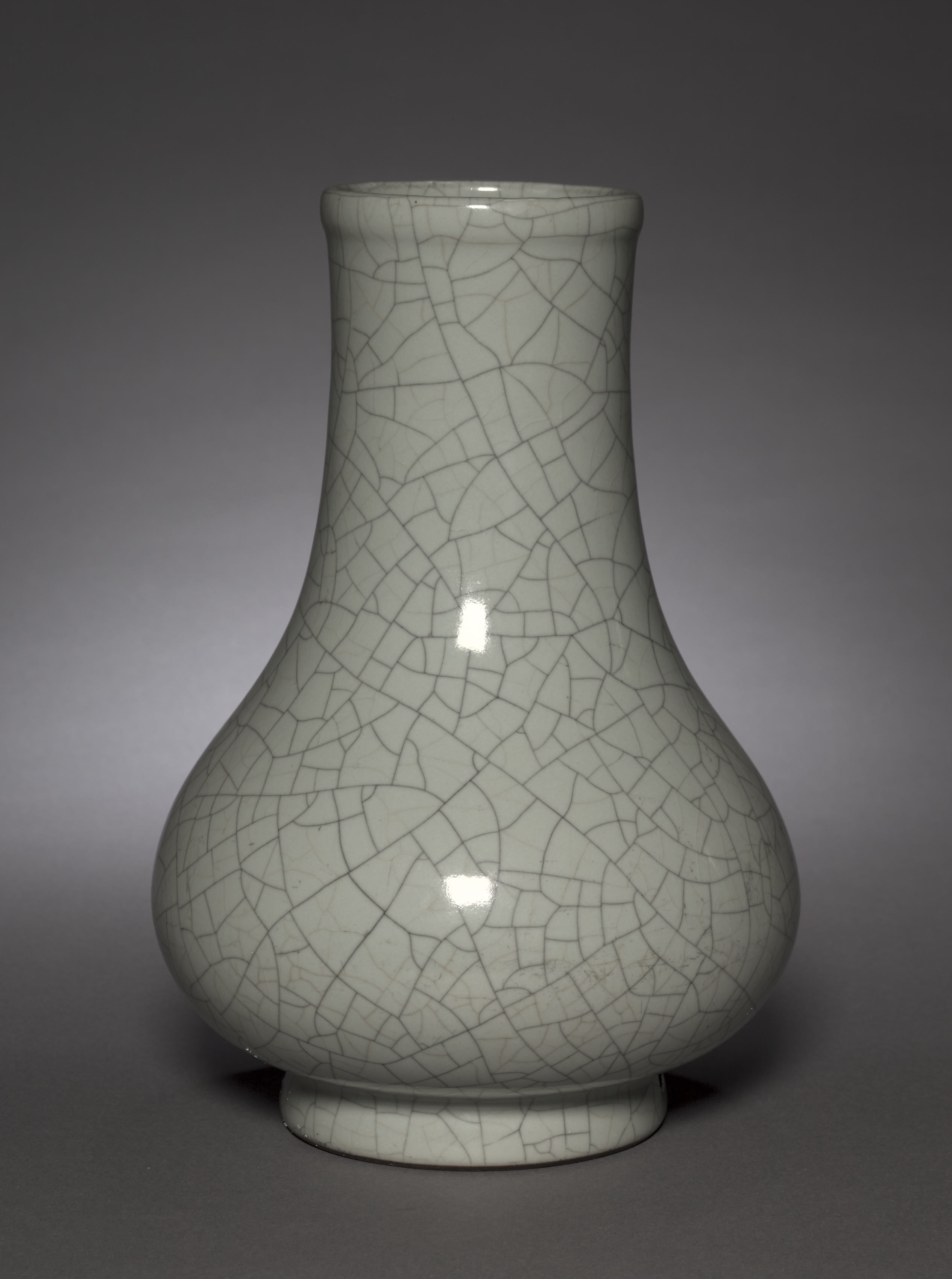 The vase, by an unknown artist, is bulbous with a rounded bottom and a short, narrow neck. The vase has a glossy, cracked light-gray glaze. A round foot is visible at the bottom. The background is dark gray and gets lighter behind the vase.