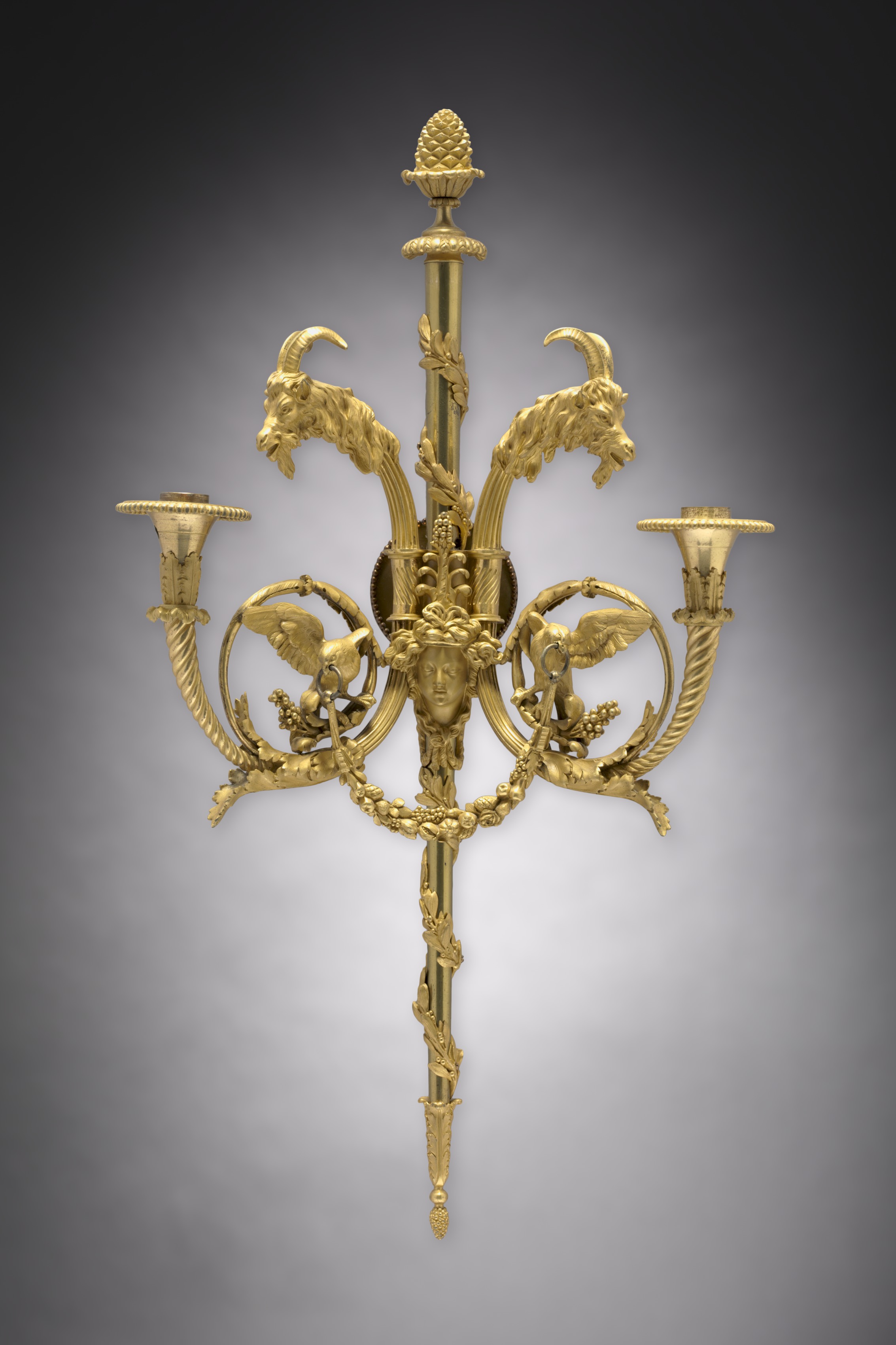 Gold-colored wall-mounted candle holder with a central stem adorned with a pinecone at the top. Two curved arms on each side, each ending in a candle cup. Two curved goat-like figures with horns are on top of the curved arms. A woman's face is in the center, surrounded by decorative elements. Two winged creatures are on either side, positioned within circular frames. The background is dark gray at the edges, fading to light gray in the center. The title of the image is "Candle Bracket".