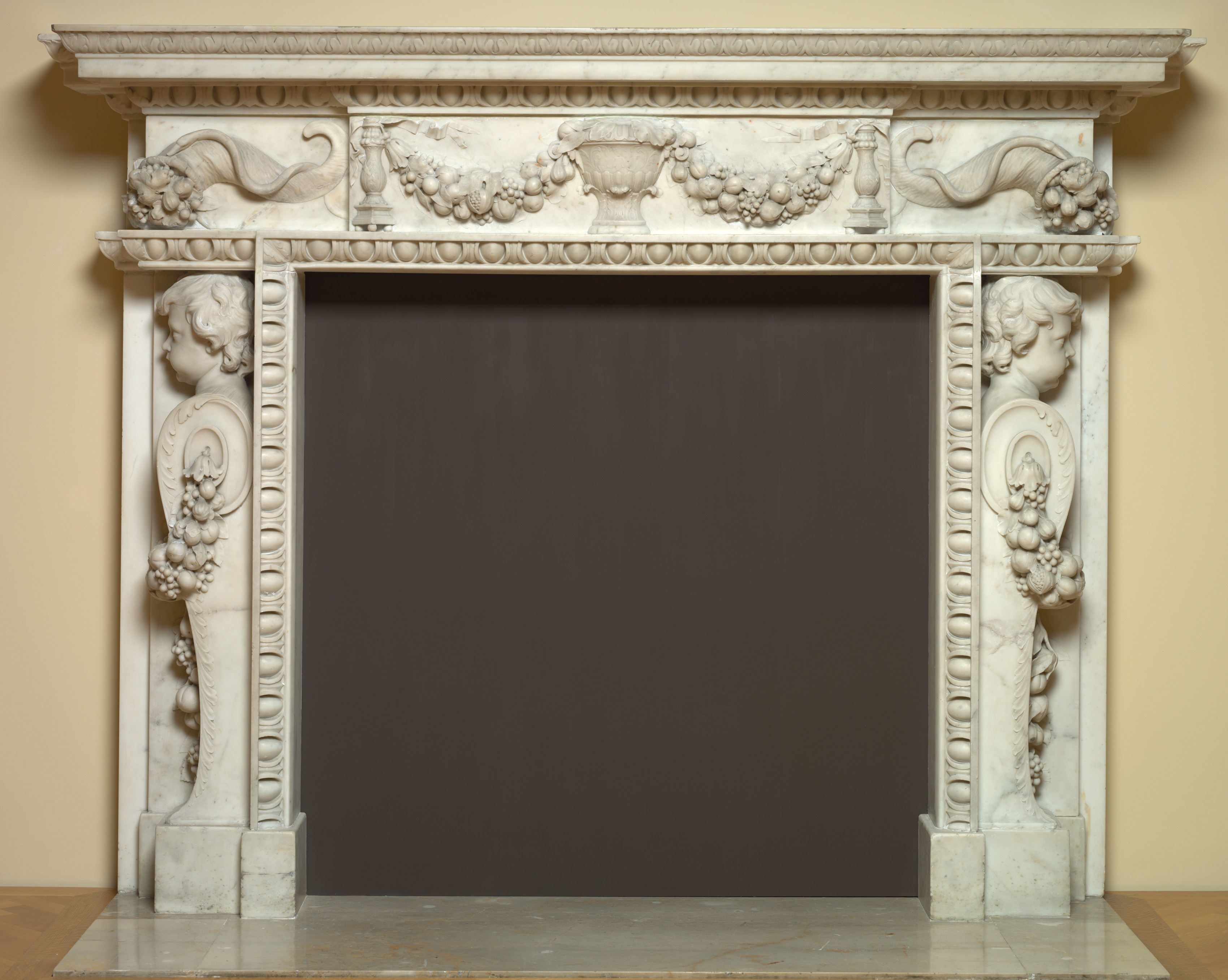 The mantel by Inigo Jones features a white marble structure with a flat top. The top section has a decorative molding along its edge and is adorned with carvings of a vase surrounded by fruit and leaves on either side. Two carved figures of young men with curly hair are on either side, each holding a circular object with fruit carved on it. The mantel's opening is rectangular and dark brown. The floor is made of shiny stone or tile and the wall behind is beige.