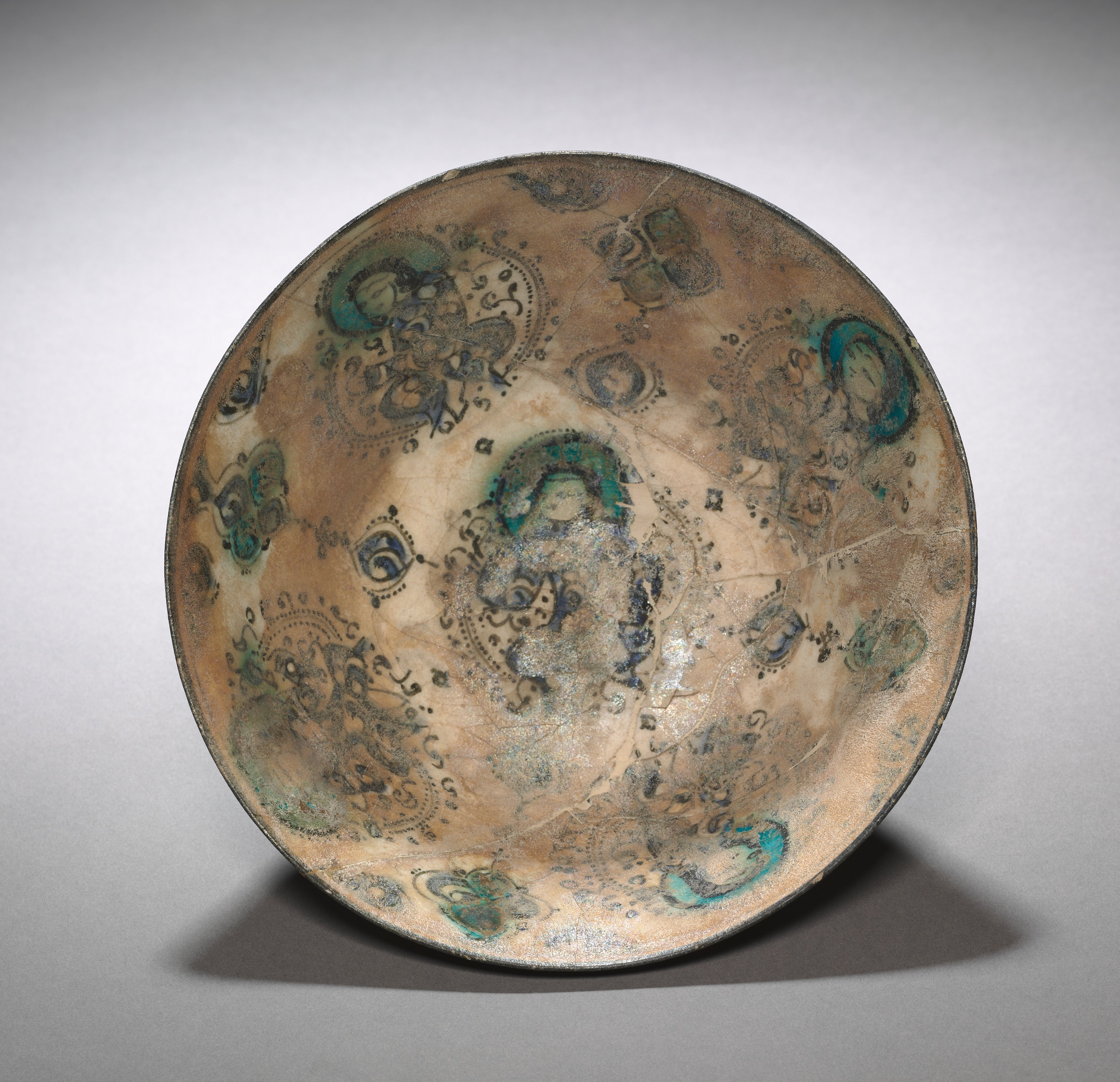 Bowl by Grayson Perry. Large bowl with rounded sides and flat bottom. The bowl's base color is beige with a darker rim. The bowl has several blue and green circular decorations on its exterior and interior. Some of the decorations are faded. The bowl also features several dark gray or black designs. The background of the image is gray with a vignette effect. The bowl casts a shadow on the surface below it.