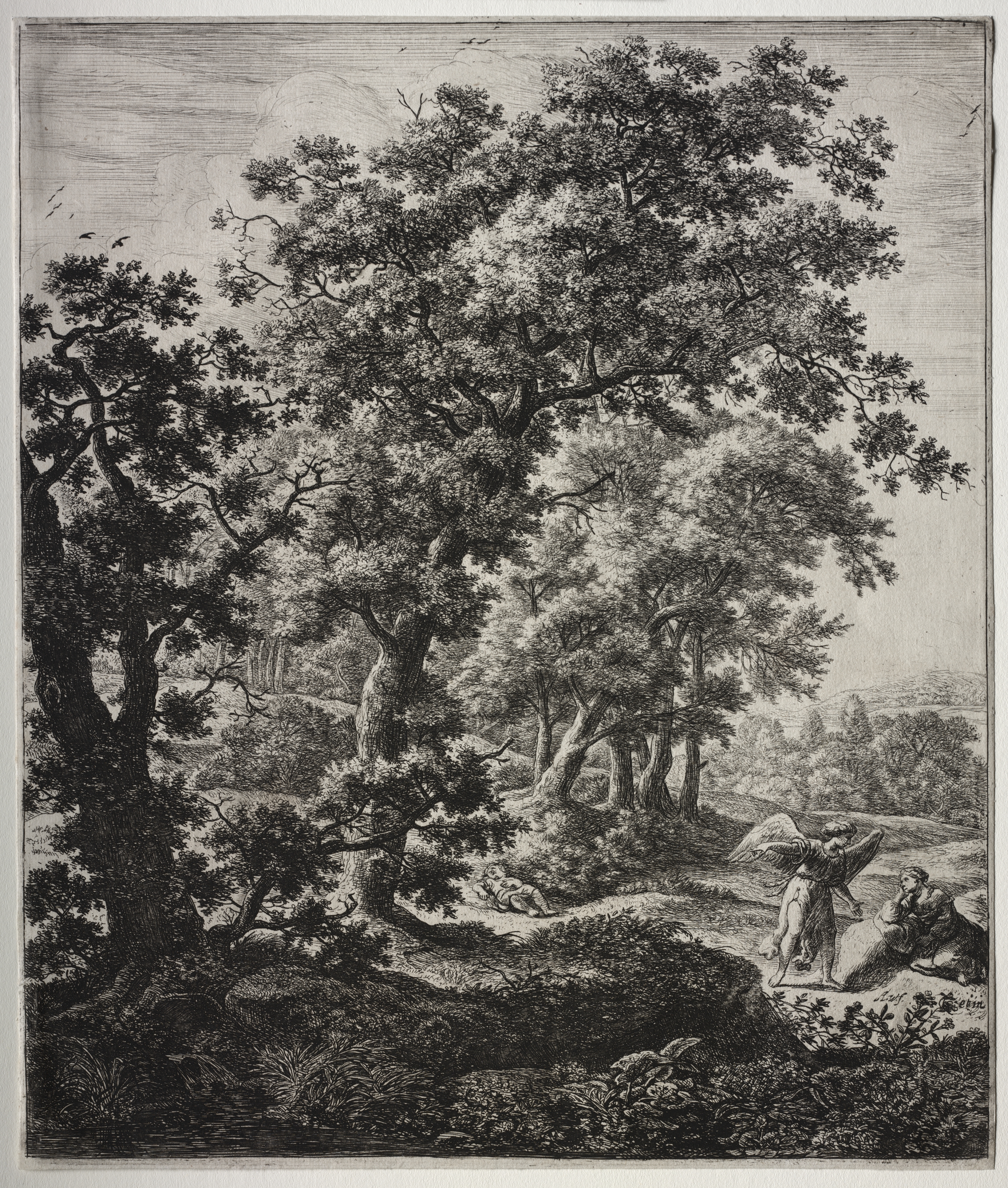 Black and white landscape drawing of large trees on a hill with a path, a seated figure on the right appears to be comforted by a standing figure with wings; background shows more trees and hills; sky has some birds.