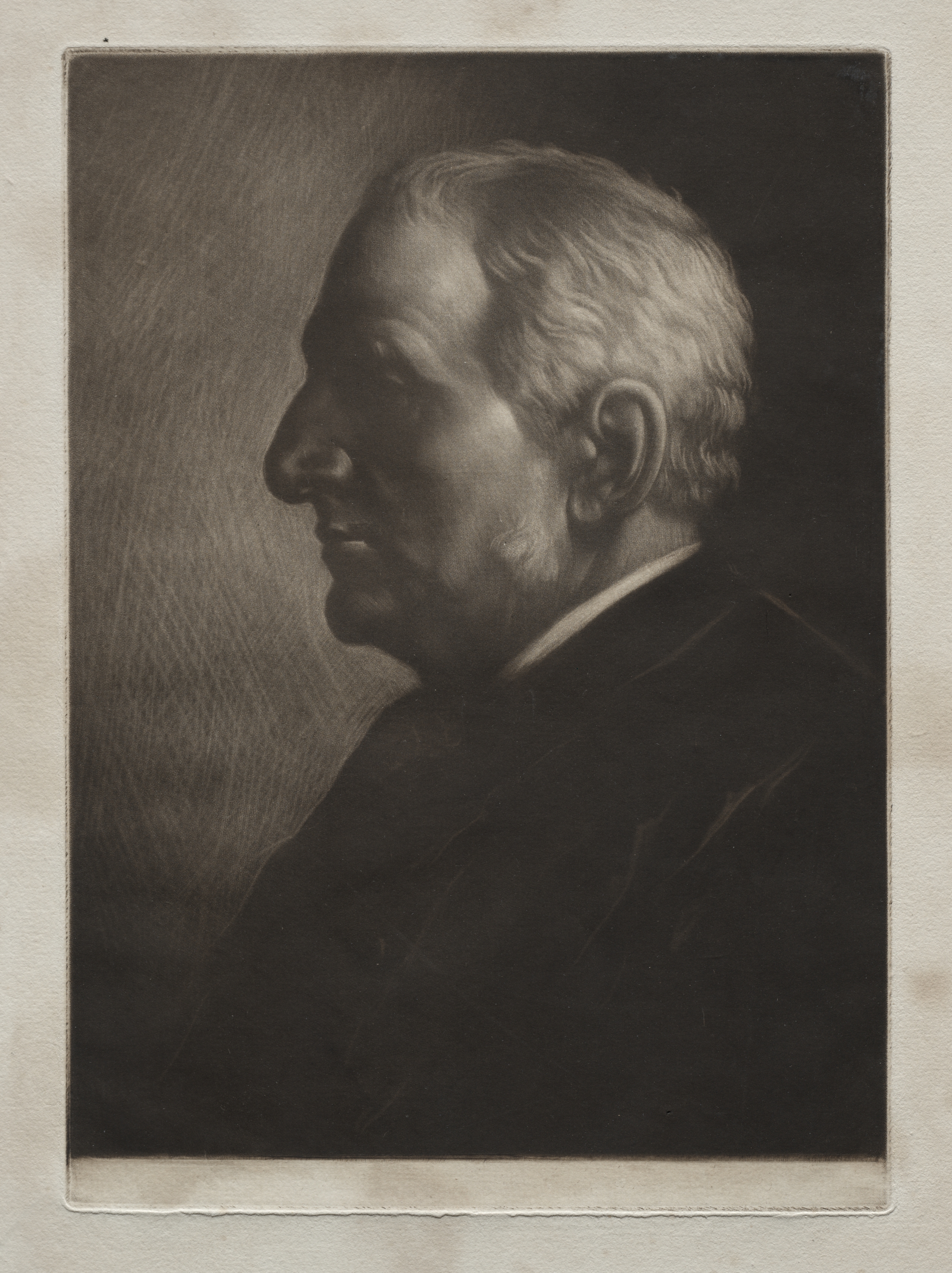Black and white portrait of an older man with short hair. The man is shown in profile, facing left. He has a prominent nose and a receding hairline. He wears a dark suit jacket with a white collar visible at the neck. The background is darker on the right side of the image and lighter on the left. The portrait is rectangular with a light-colored border around the edges. The image is in a range of grays.