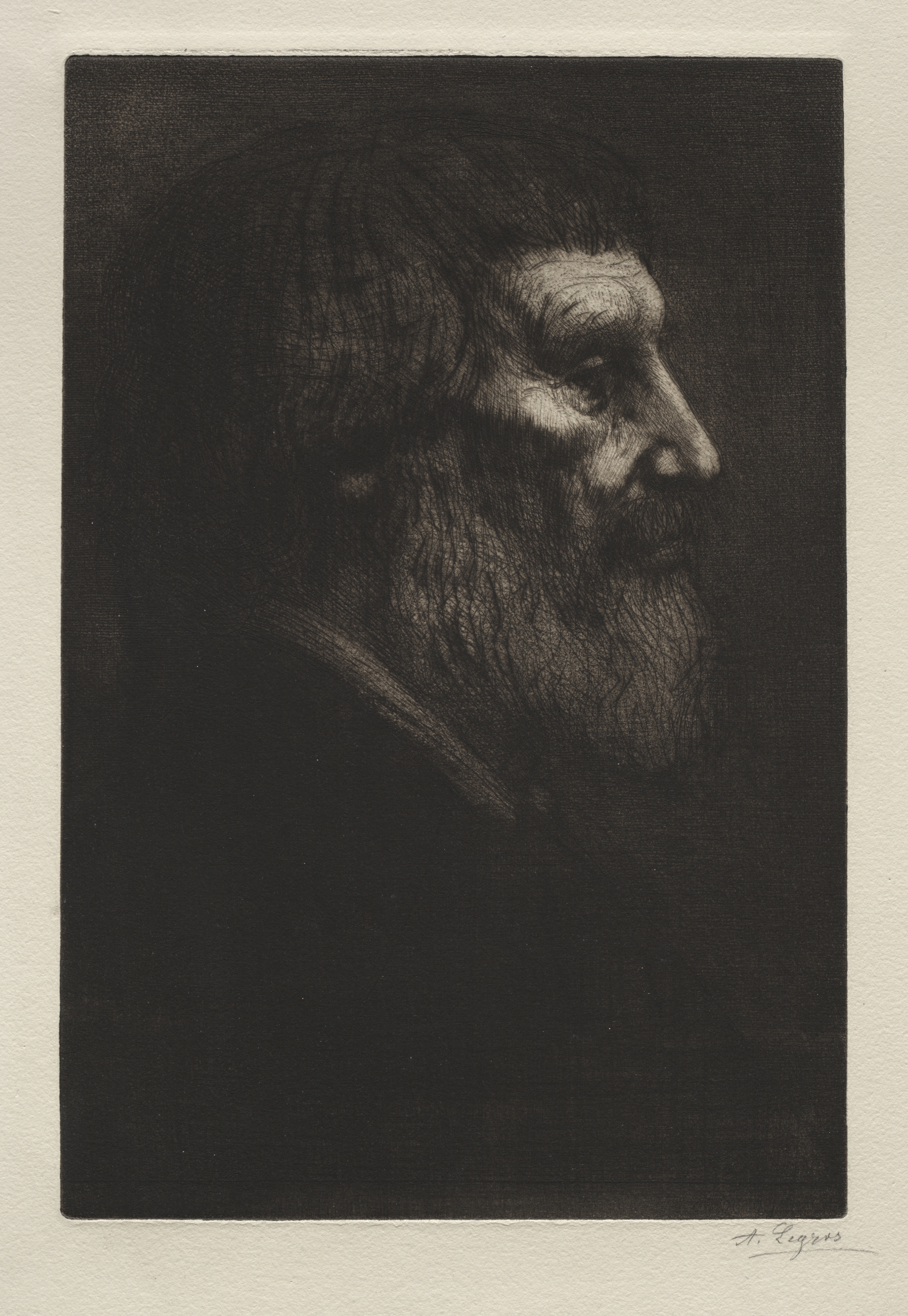 Black and white portrait of a man, profile view. The man has short hair, a long beard and mustache, and is facing right. The image is a side view, showing the left side of the man's face. The man appears to have a serious expression, with deep wrinkles on his face. The background of the portrait is dark, with the man's face and hair lighter. The portrait is on a beige background, and the artist's signature is in the bottom right corner. The portrait's color scheme is primarily black, white, and shades of gray. The portrait is rectangular.