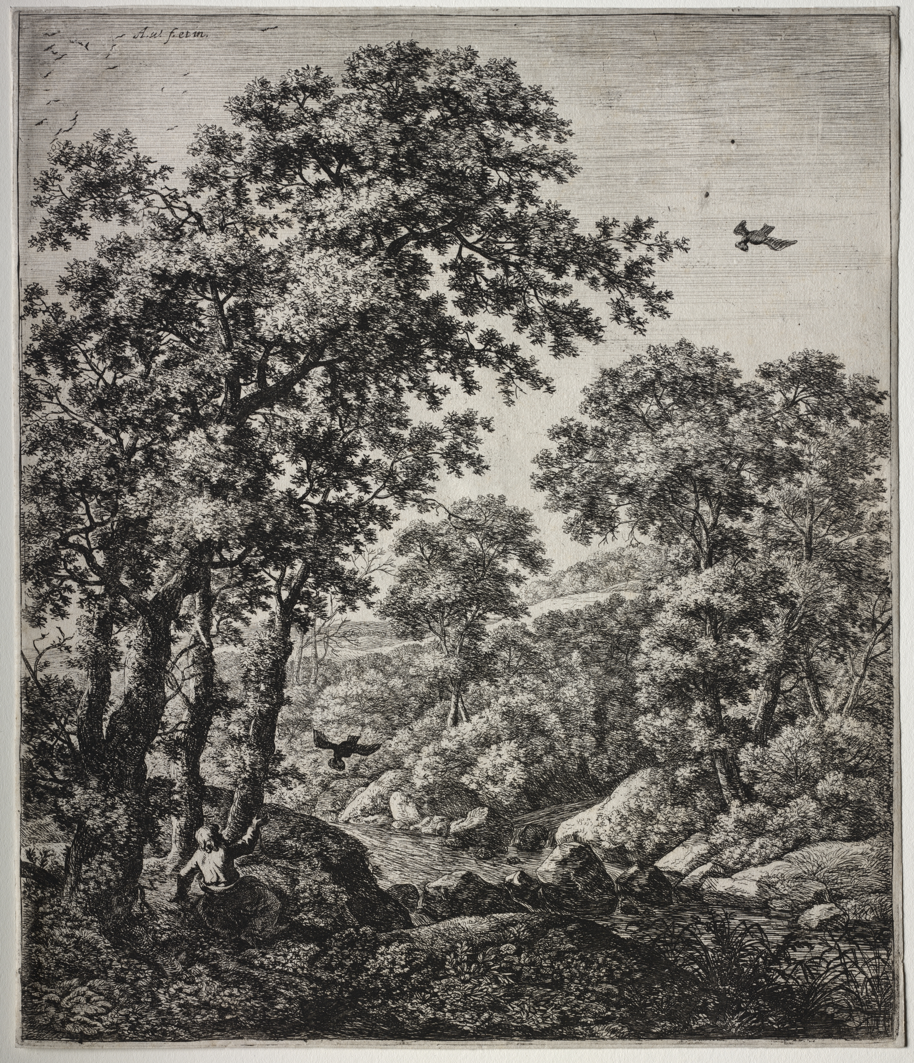 Black and white landscape drawing of a man sitting on a rock amongst trees and bushes. The man is bearded and wears a white robe. Two ravens fly above him. Large trees with thick trunks stand to the left. The foreground features plants and rocks. The sky is light with birds flying in the top left corner.