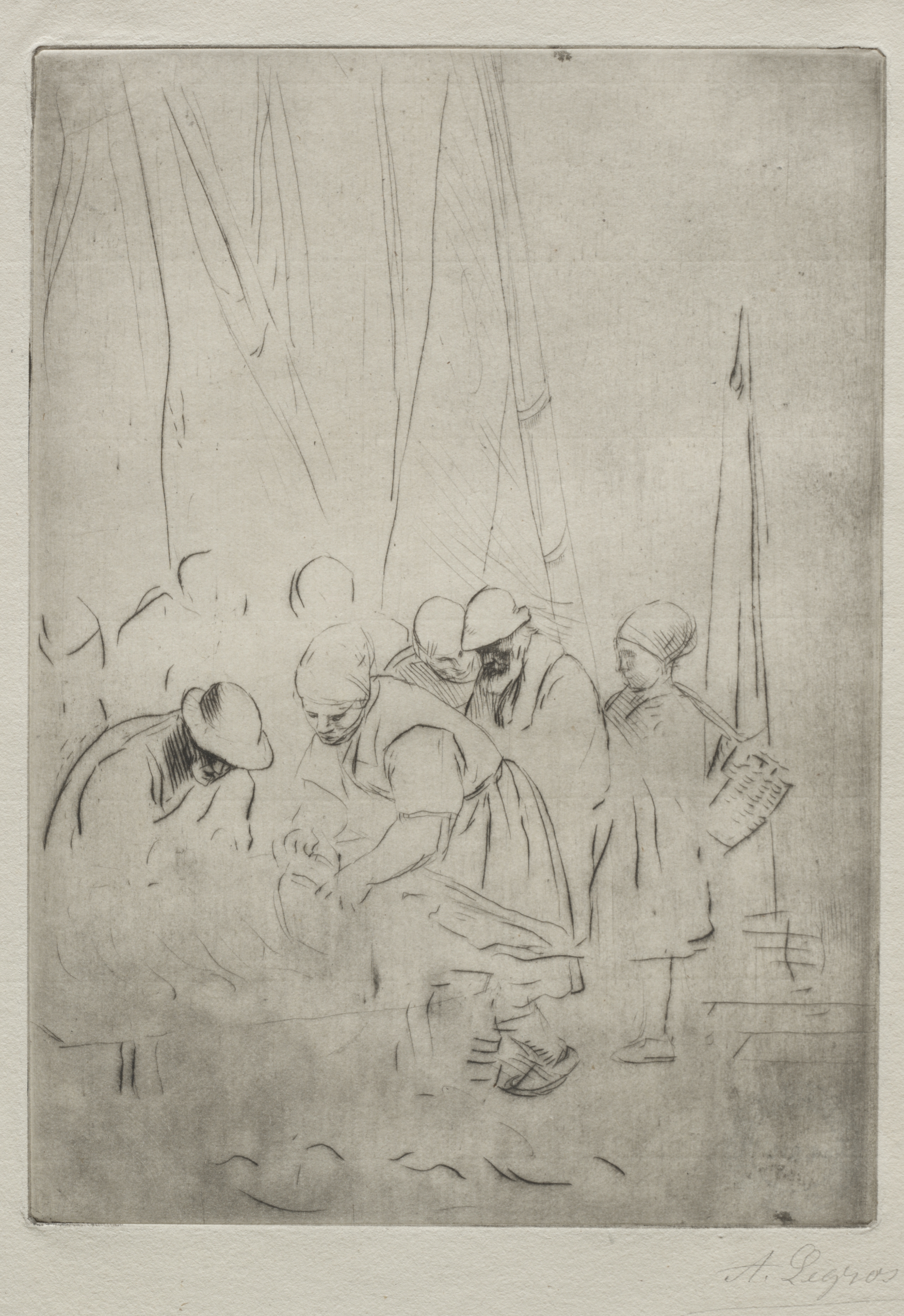 A grayscale sketch depicts a group of people on a wharf. The people are grouped on the lower center and left of the image. The people are dressed in casual clothing and hats. A young boy to the right holds a basket. The background shows the mast of a boat behind the people. The image is signed in the bottom right. The title reads: Fishermen on the Wharf at Boulogne. The artist is Alphonse Legros.