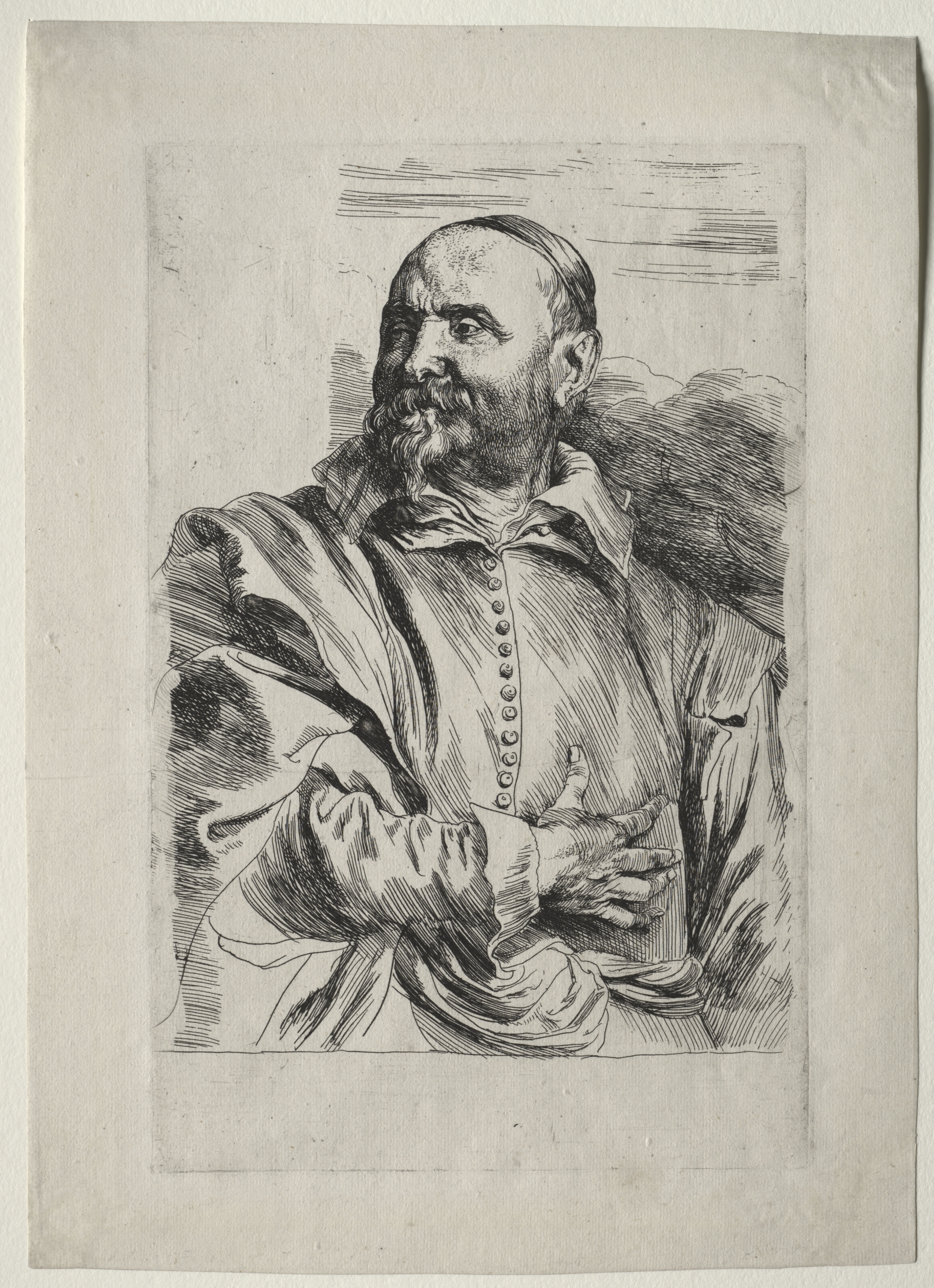 Black and white drawing of a man with a receding hairline and beard looking to his right. He is wearing a shirt with a collar and buttons down the front. His arms are crossed. He has a cloak or shawl over his shoulders. The background has lines suggesting clouds or shading. The image is on a rectangular piece of paper with a lighter border around it. The title of the piece is "Jan Snellinx" and it is by the artist "Anthony van Dyck".