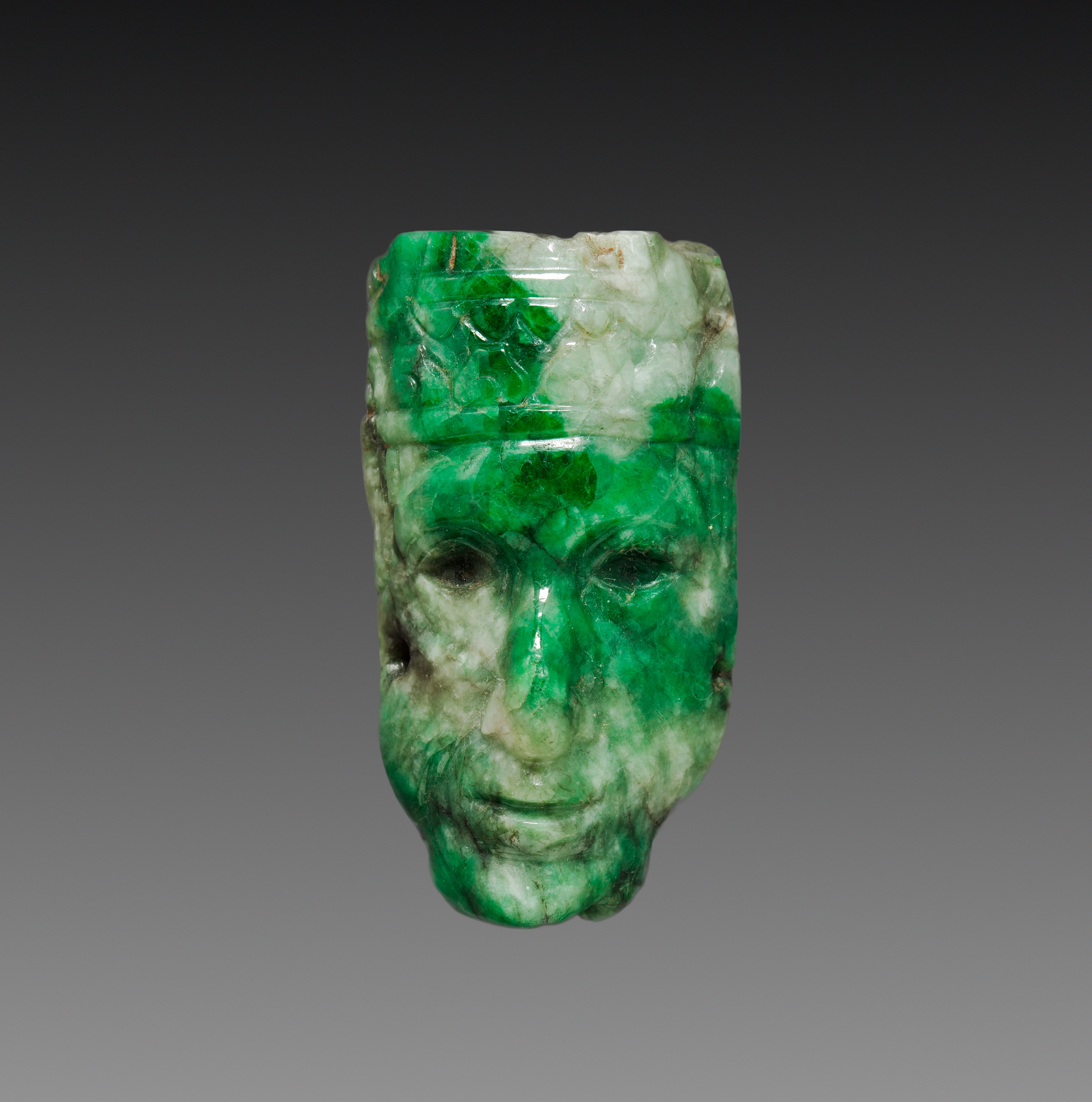 The Head Ornament by artist is a sculpture of a human head made from a green stone. It has a shiny surface. The stone is predominantly green with white marbling throughout. The head is carved with simple facial features, including a nose, mouth, and eyes. A cylindrical piece of stone sits atop the head, wider at the top than at the base. The face has a subtle, enigmatic expression. The background of the image is gray, transitioning from dark at the top to light at the bottom.
