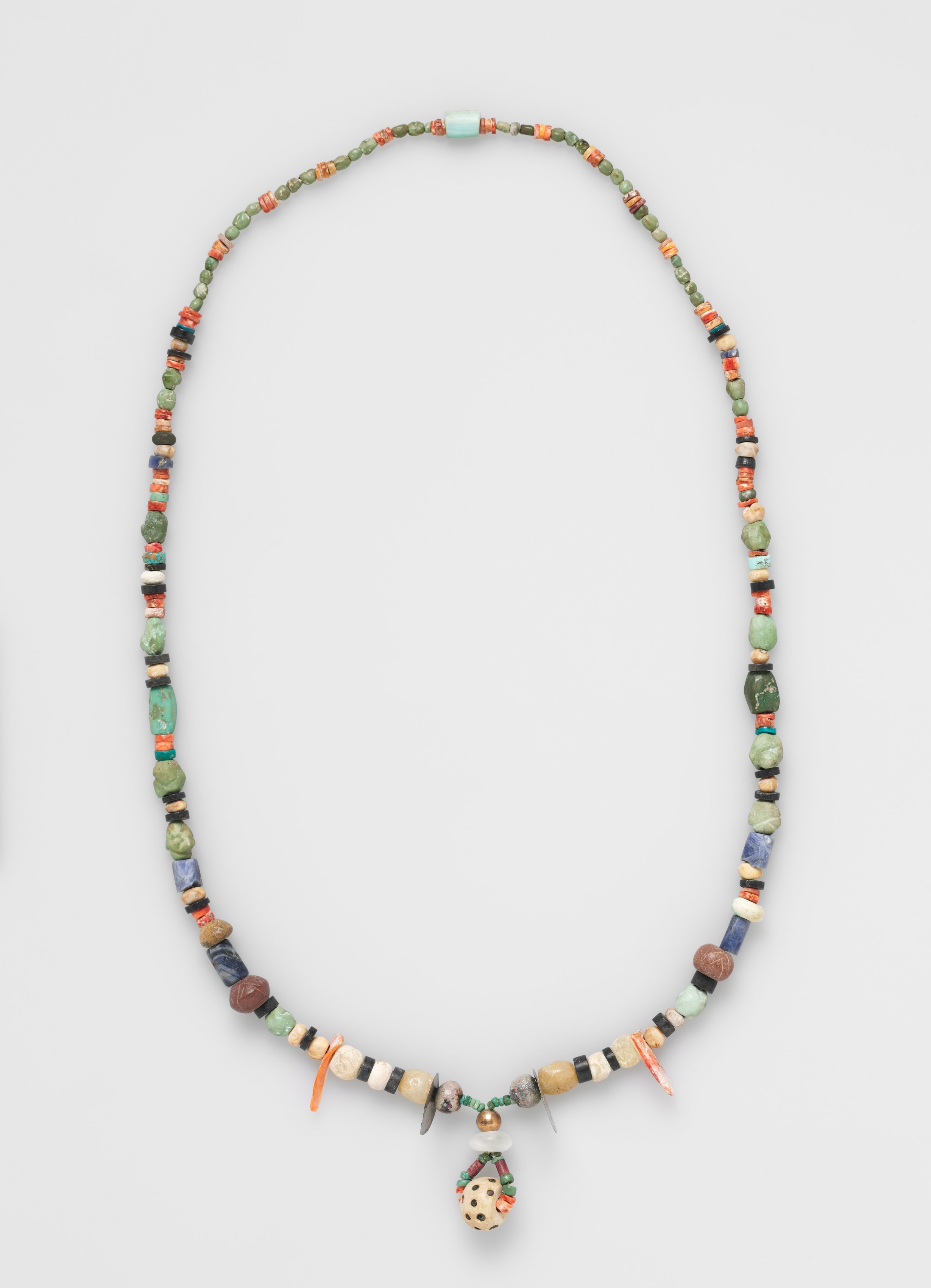 Multicolored necklace with various shaped beads. Beads are mostly small and spherical, some cylindrical. Colors include green, orange, black, brown, blue and white. Large spherical white bead with black and green dots hangs from bottom center. Beads are not uniform in size or shape. A cylindrical light blue bead is on top. Background is light gray. Artist: Necklace.