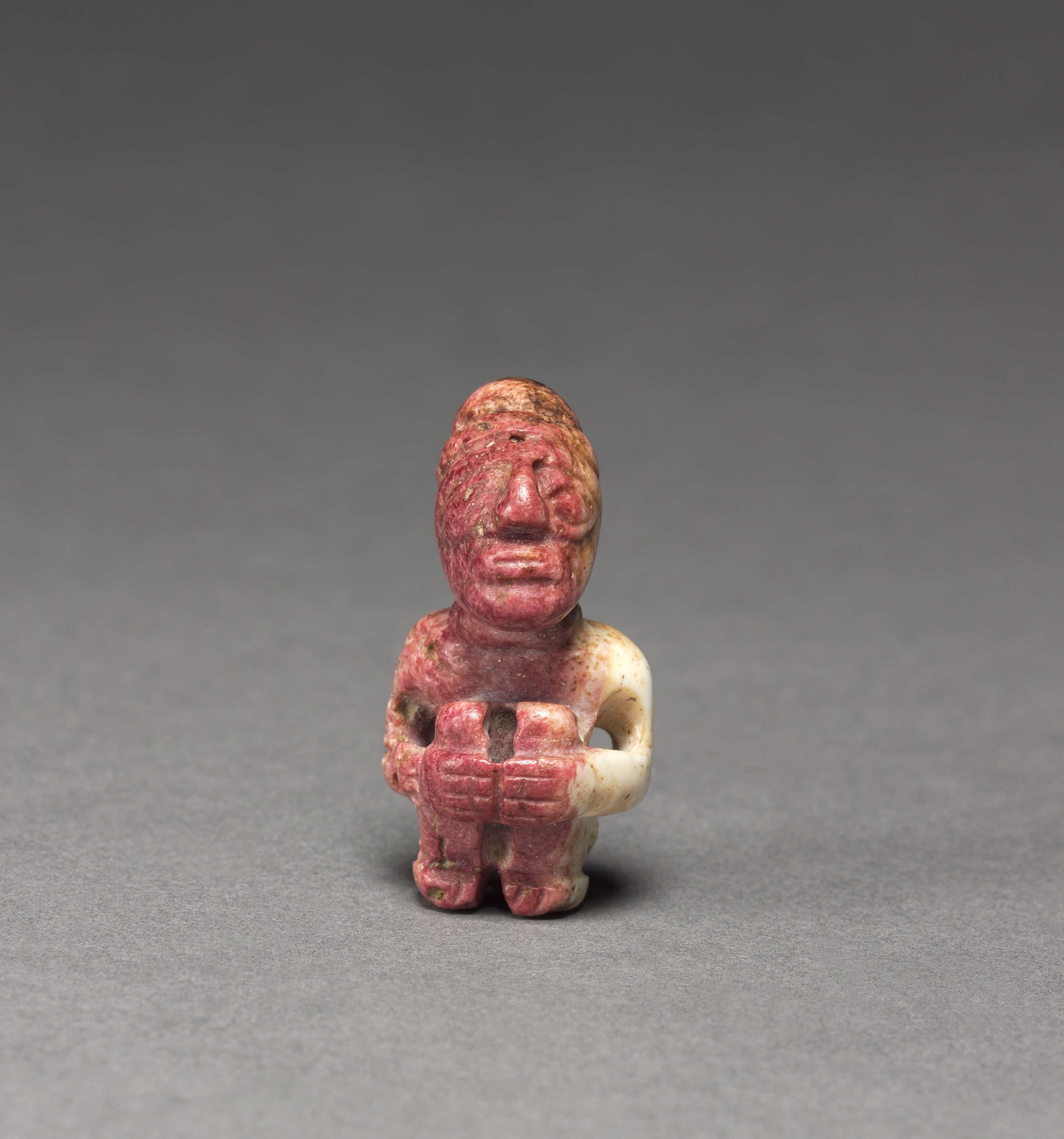 The Seated Figurine by the artist depicts a small, solid figurine of a person. The figurine has a rounded head with a flat face, a small nose, and no discernible mouth or ears. The head, arms, and legs are pink with tan speckles, while the back and right arm are white. The hands are folded across the stomach. The figurine appears to be made of stone or ceramic and has a rough texture. The background is a plain gray surface with a darker gray gradient at the top.