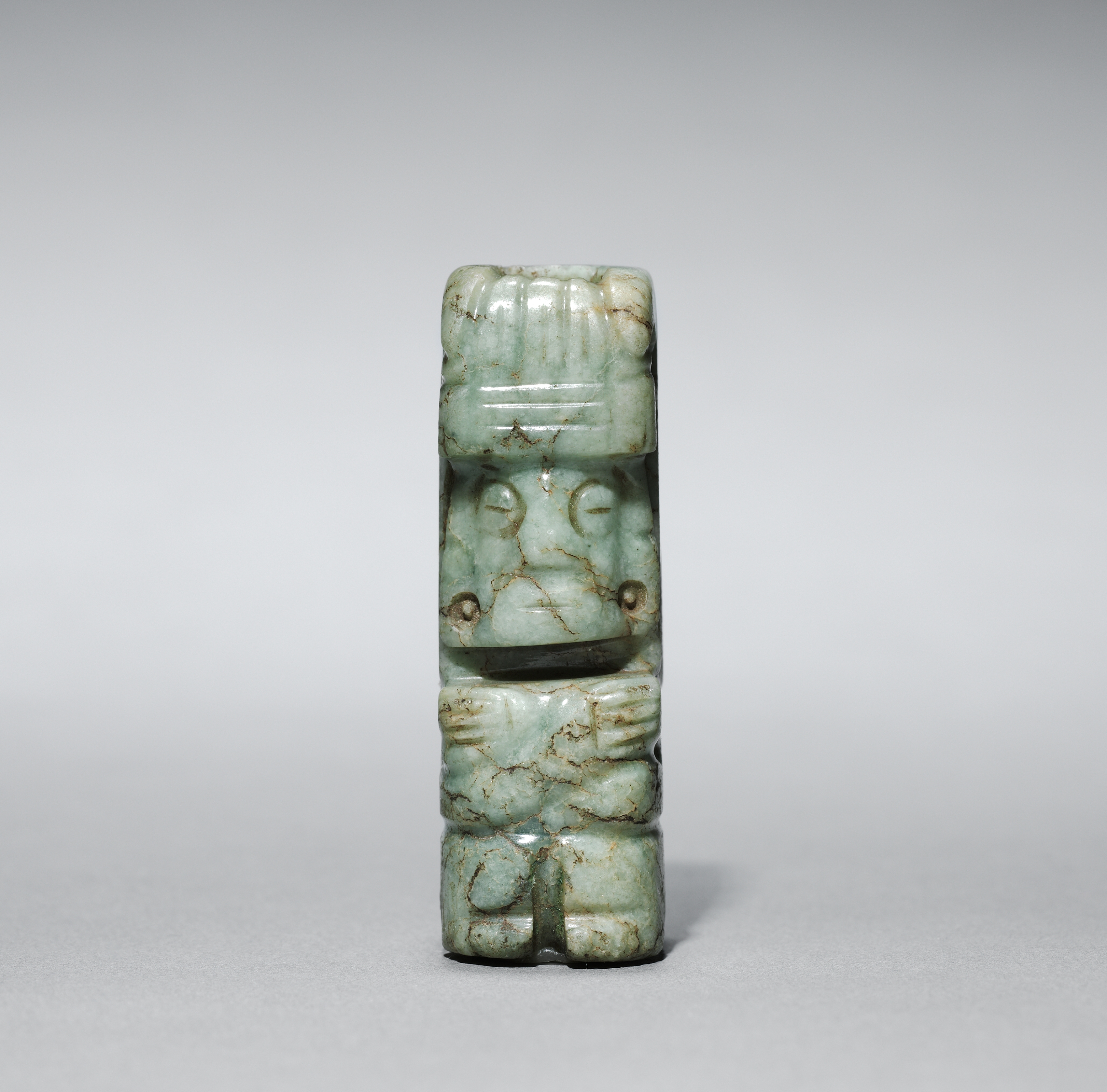 Figurine pendant by M.C. A green jade or stone figurine pendant with a glossy finish, rectangular and tall with a wide top tapering down. The figurine has a face carved on the top with two small holes on either side. It has a wide mouth with a line through the middle, and two curved lines for eyes. The body is adorned with arms folded across the stomach and legs. The object has a smooth surface with darker green and brown veins running through it. The background is plain gray.