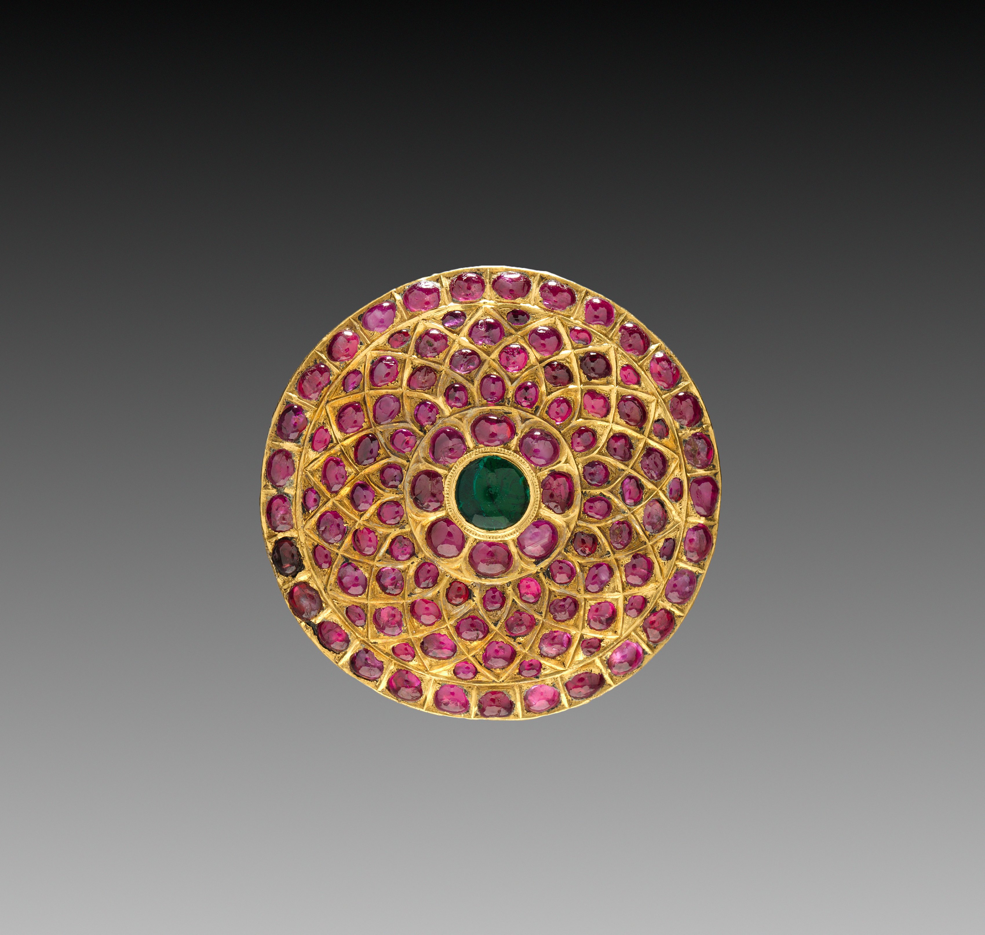 Round gold hair ornament by Jada Billi, featuring a green stone surrounded by pink stones in a circular pattern. The green stone is positioned in the center, encircled by multiple concentric circles of small pink stones. The background of the image transitions from black at the top to gray at the bottom.