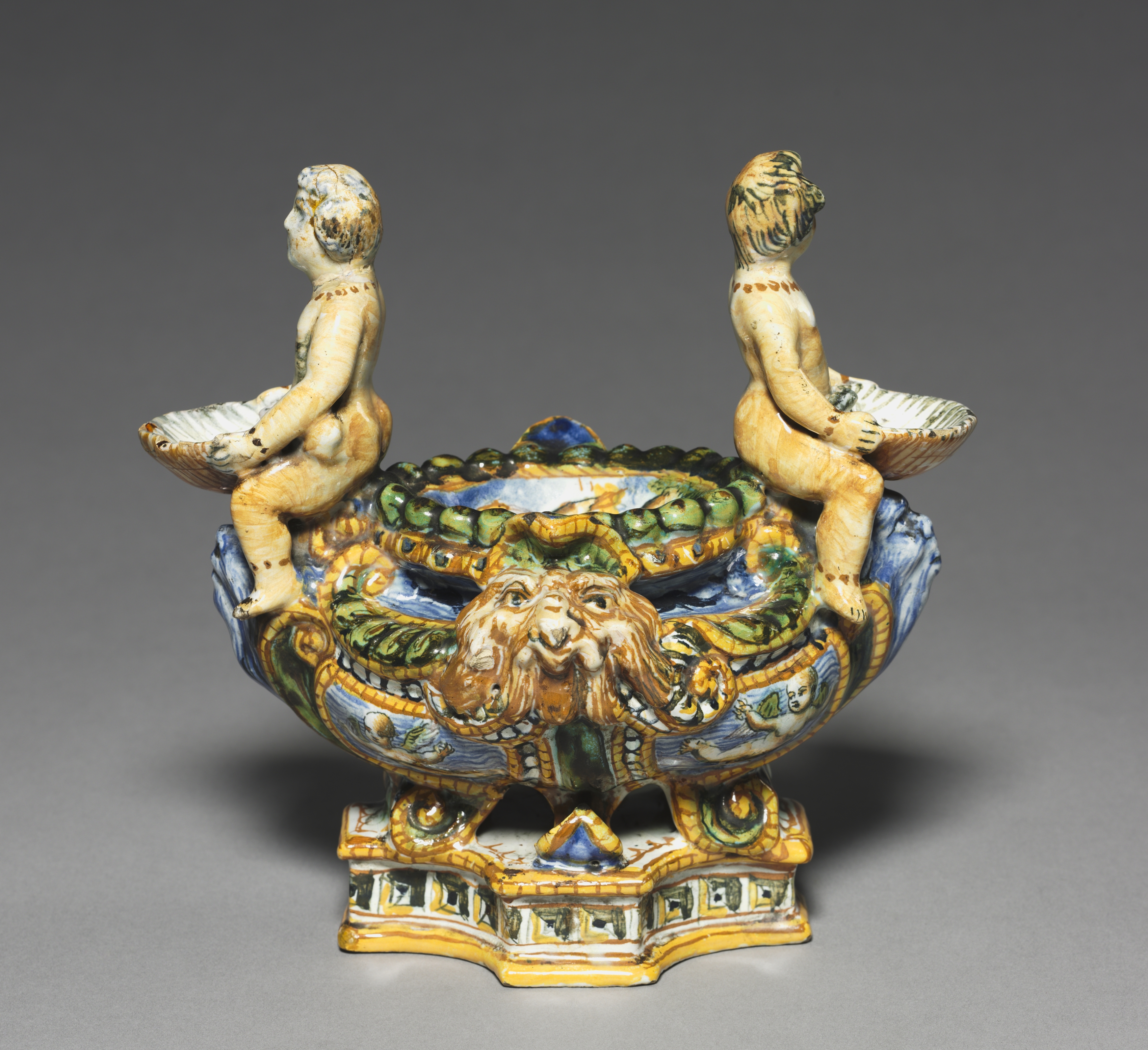 Saltcellar by the Patanazzi Family, ceramic object with a wide, ornate bowl featuring a lion's head at the front. The bowl adorned with colorful designs in blue, green, yellow, and white. Two small, nude figures of children sit on either side of the bowl, each holding a small dish. The object rests on a decorative base with a gray gradient background.