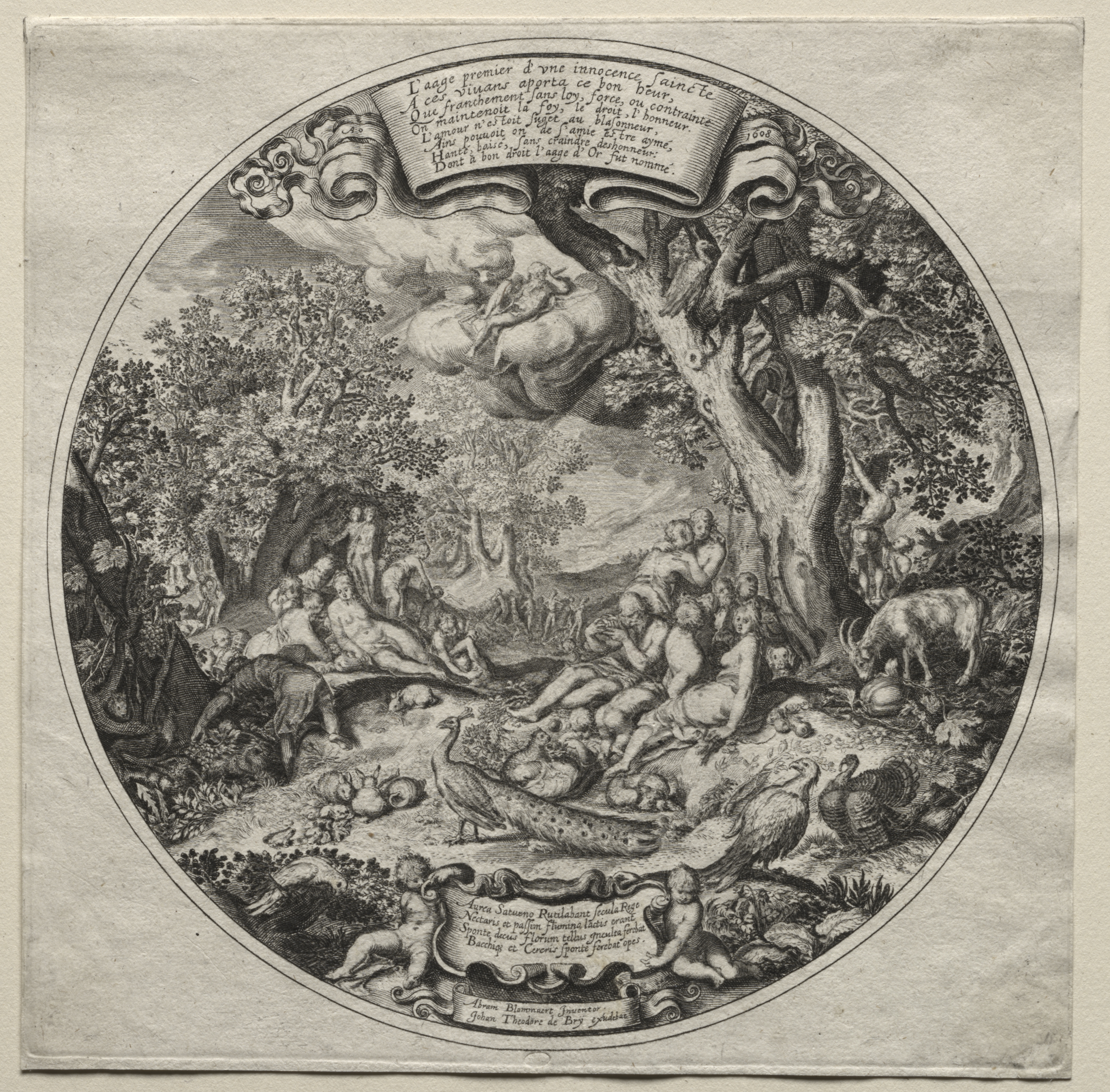 The image depicts a circular scene with a thick black outline. The scene inside the circle shows nude people sitting and lying on the ground in a wooded area with trees on both sides and in the background. Some people are on the left side sitting on a branch, one person on the right side is standing. There are animals in the scene including a large fish on the ground, a bull on the right side, and several birds. A tree trunk on the right side curves up and around to the top centre. There is a cloud at the top centre with a figure laying on it. A scroll-like banner with writing on it appears to come from the cloud. There is a decorative scroll-like banner with writing on it across the bottom. The background of the image outside the circle appears to be a light-colored paper or parchment.