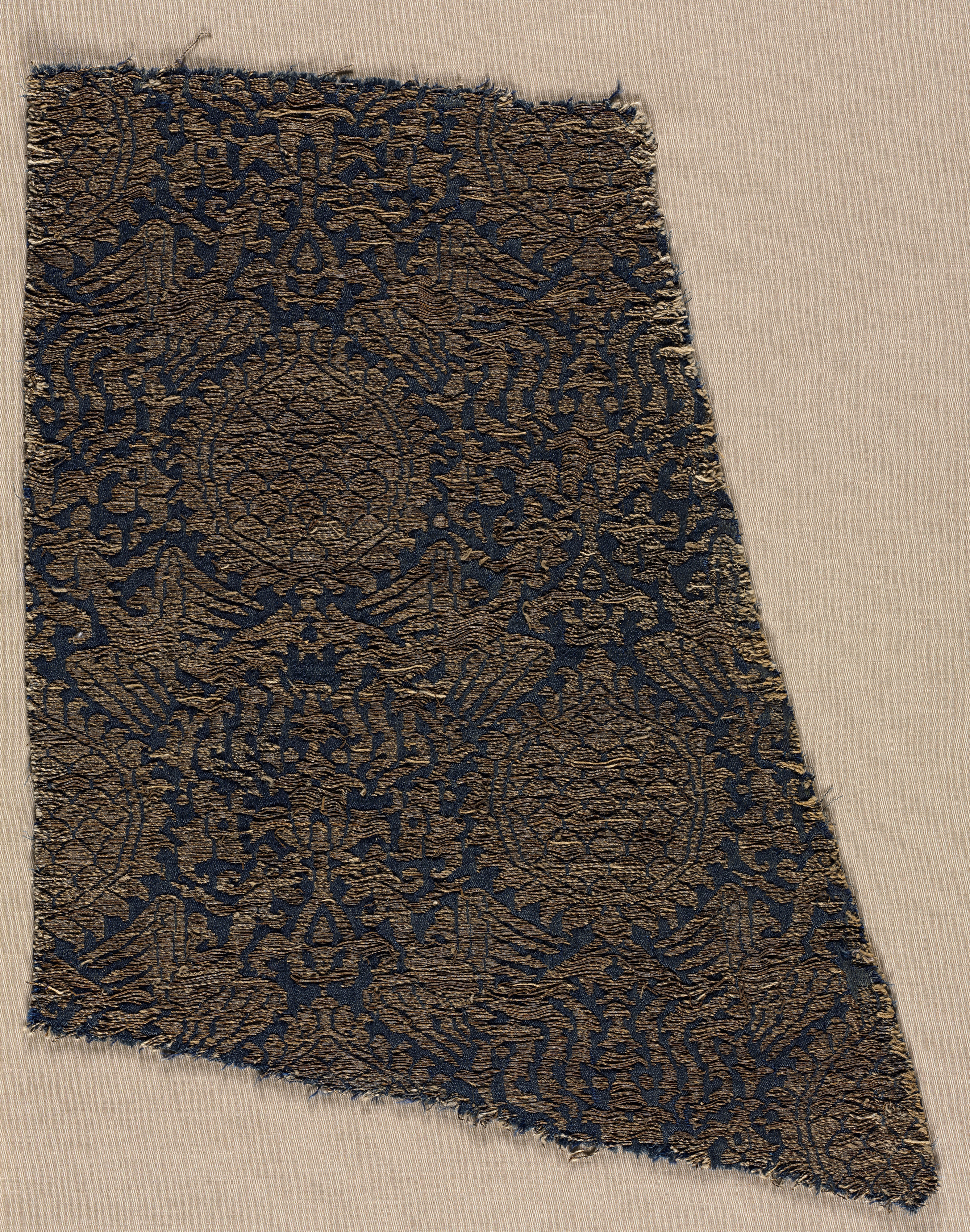 Dark blue textile with gold patterning, rectangular with frayed edges; primarily featuring a repeating design of palmettes and phoenixes. The background of the fabric is dark blue with gold accents. Phoenixes and palmettes are dispersed across the fabric in a symmetrical pattern. The gold details are textured and have a raised appearance against the smooth blue background. The edges of the fabric are frayed.