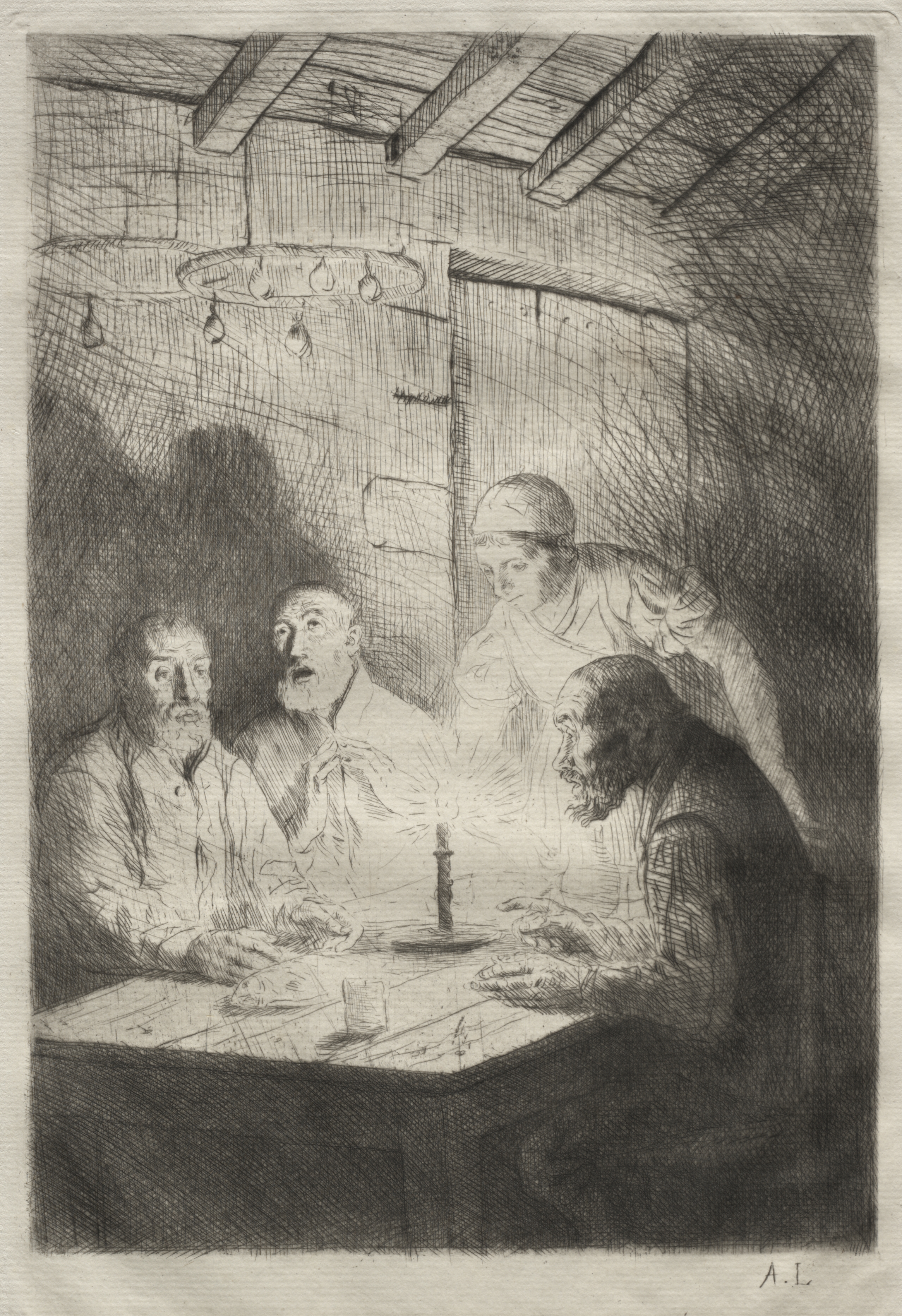 The image depicts a black and white drawing of four people in a dimly lit room. The scene shows a group gathered around a square table. There are two men on one side of the table and one man and one woman on the other side. The two men on the left side are facing right. The man on the far left has a receding hairline and a beard and is wearing an open-necked shirt. The man next to him has a mustache and goatee and appears to be holding something up to his mouth. The woman stands behind them, wearing a head covering, and appears to be serving food. The man on the right side of the table has a balding head with a beard and is leaning forward. On the table is a candle and several plates. The walls are made of stone blocks and there are wooden beams on the ceiling. The atmosphere appears somber. The title of the piece is "Le Souper chez misère" and the artist is Alphonse Legros.