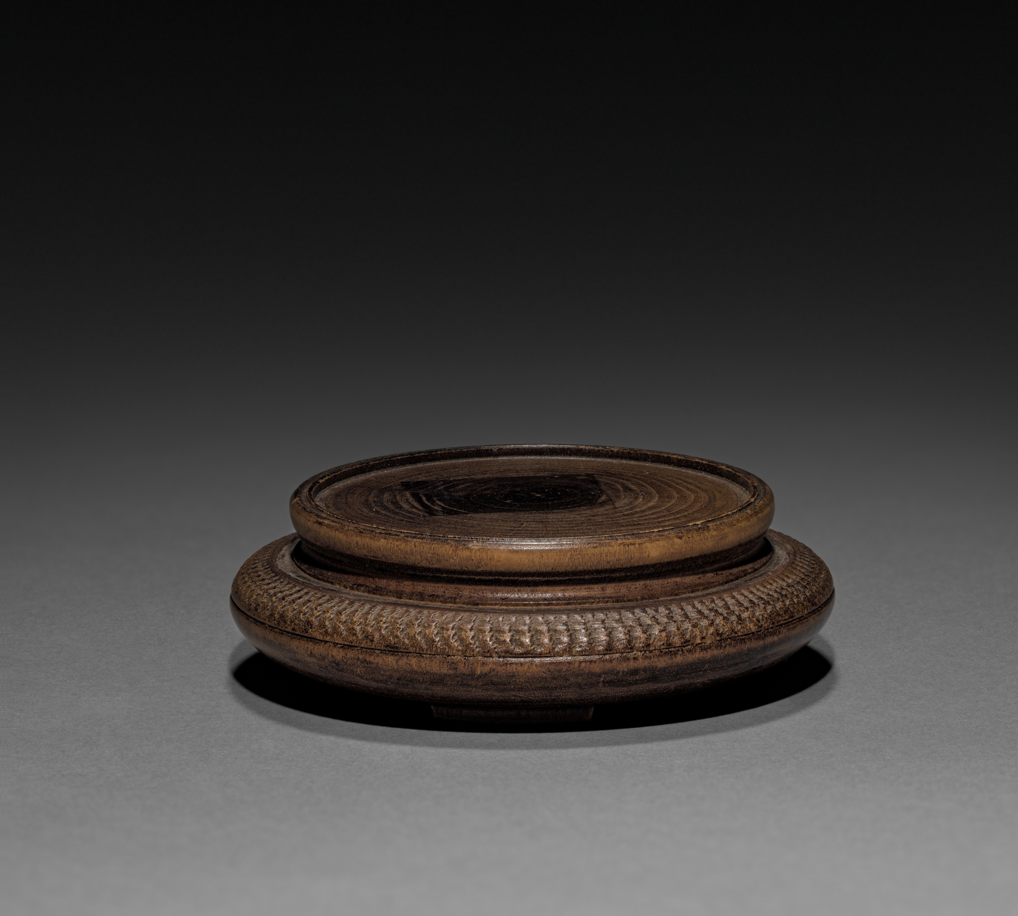 Dark brown wooden base, round and low, with two distinct sections. The top section is flat and circular with concentric circular grooves. The lower section is wider and has a carved rope-like pattern around its circumference. The base sits on a gray surface with a shadow underneath it, against a dark background that lightens towards the bottom. The title is "Kneeling Boy (base)" and the artist is not specified but could be searched with the title for results.
