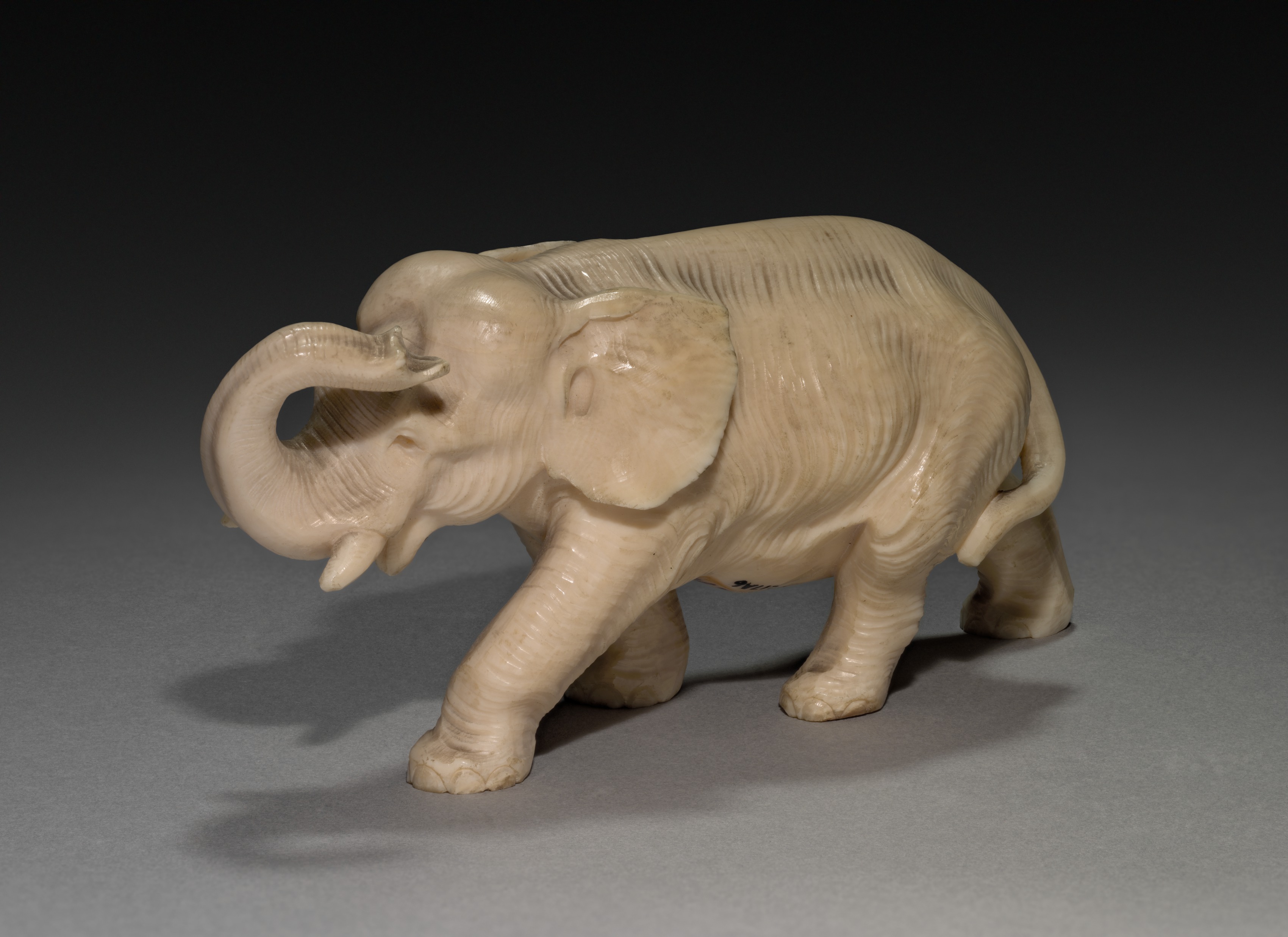 The sculpture depicts an elephant titled "Elephant" by the artist. The elephant is made of a light-colored material, possibly ivory or plastic. The elephant's body faces left; its head is turned to the left. The elephant's trunk is raised and curled. The elephant's tusks are visible. The elephant has four legs. The elephant's ears are large and hang down. The elephant's body has wrinkles. The background is dark gray to black, with a light gray surface. The elephant casts a shadow on the surface. The image is a close-up shot.