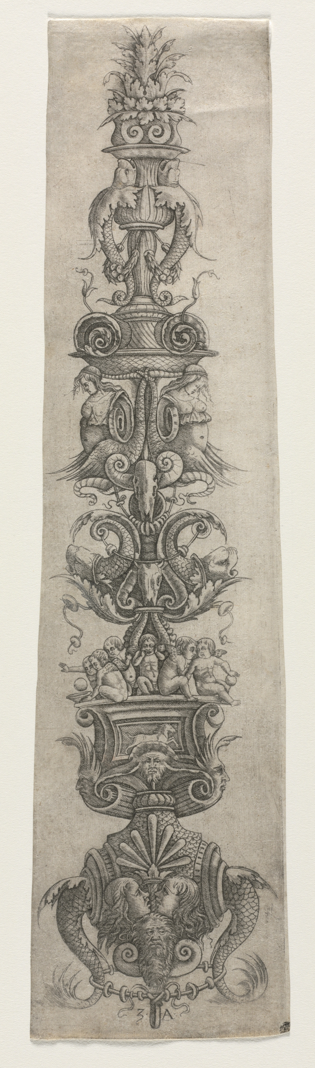 The image depicts an elongated, vertical drawing on a beige background. The drawing features six distinct sections stacked on top of each other. The top section shows a plant-like design. The second section features a candelabra with two dolphins on either side. The third section consists of a decorative design with curved lines and what appears to be a bird-like figure. The fourth section contains four creatures resembling cupids and four creatures resembling nereids, with their legs extended in a dancing-like position. The fifth section features a lion head with a decorative design around it. The bottom section shows a design with curved lines and what appears to be two masks on either side, accompanied by a decorative element extending downwards. The overall design includes various masks, cupids, and nereids.
