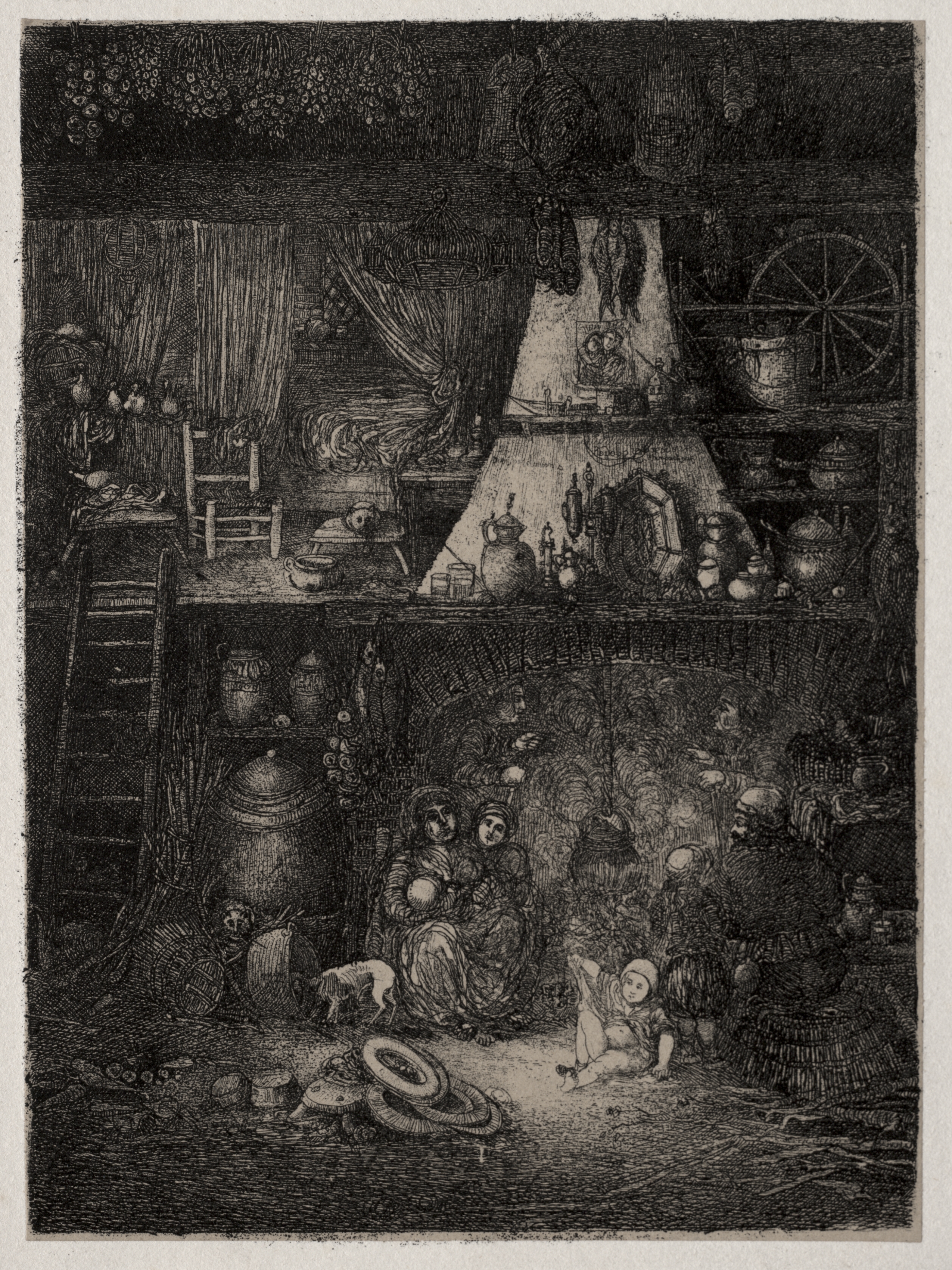 Black and white image. Dark background. A dimly lit interior scene with several people and a dog. The people are sitting on the floor. A woman holds a baby. A man sits at a table with his head in his hands. A shelf above them holds various household items, including pots, pans, and a wheel. A staircase is on the left. The floor is cluttered with objects. The walls are dark. The overall atmosphere is somber. The image is titled "Peasant Interior in the Haute-Garonne" and is by Rodolphe Bresdin.
