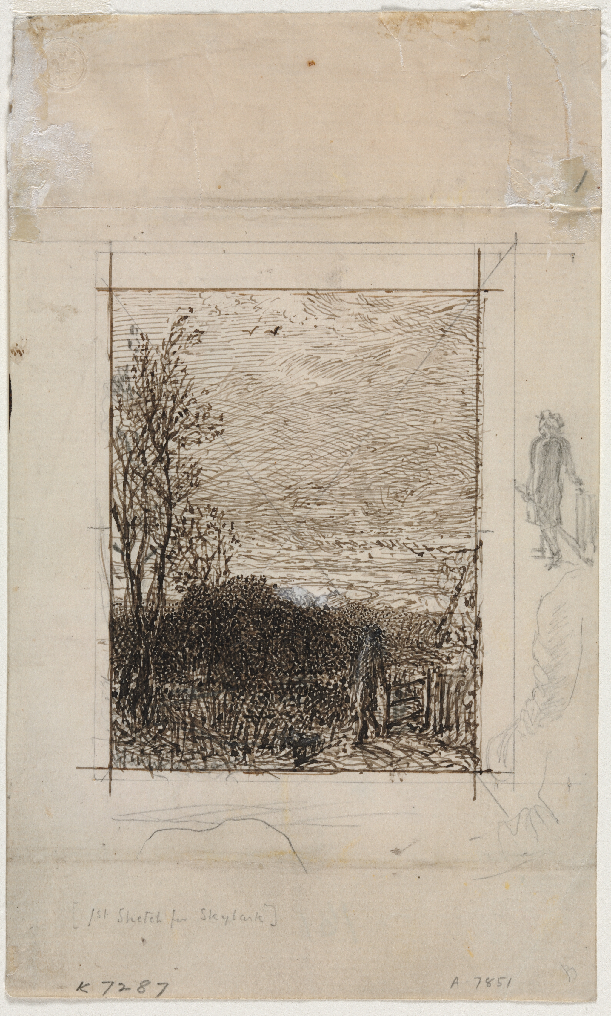 The image depicts a landscape drawing of a field with trees on the left side and a hedge or mound in the center. A square border is drawn around the landscape. The sky above has many short lines indicating texture or movement. A small sketch of a person holding something is on the right side of the paper. The paper is aged, with some discoloration and wear visible, particularly at the top. There is faint writing at the bottom, which reads "1st Sketch for Skylark".