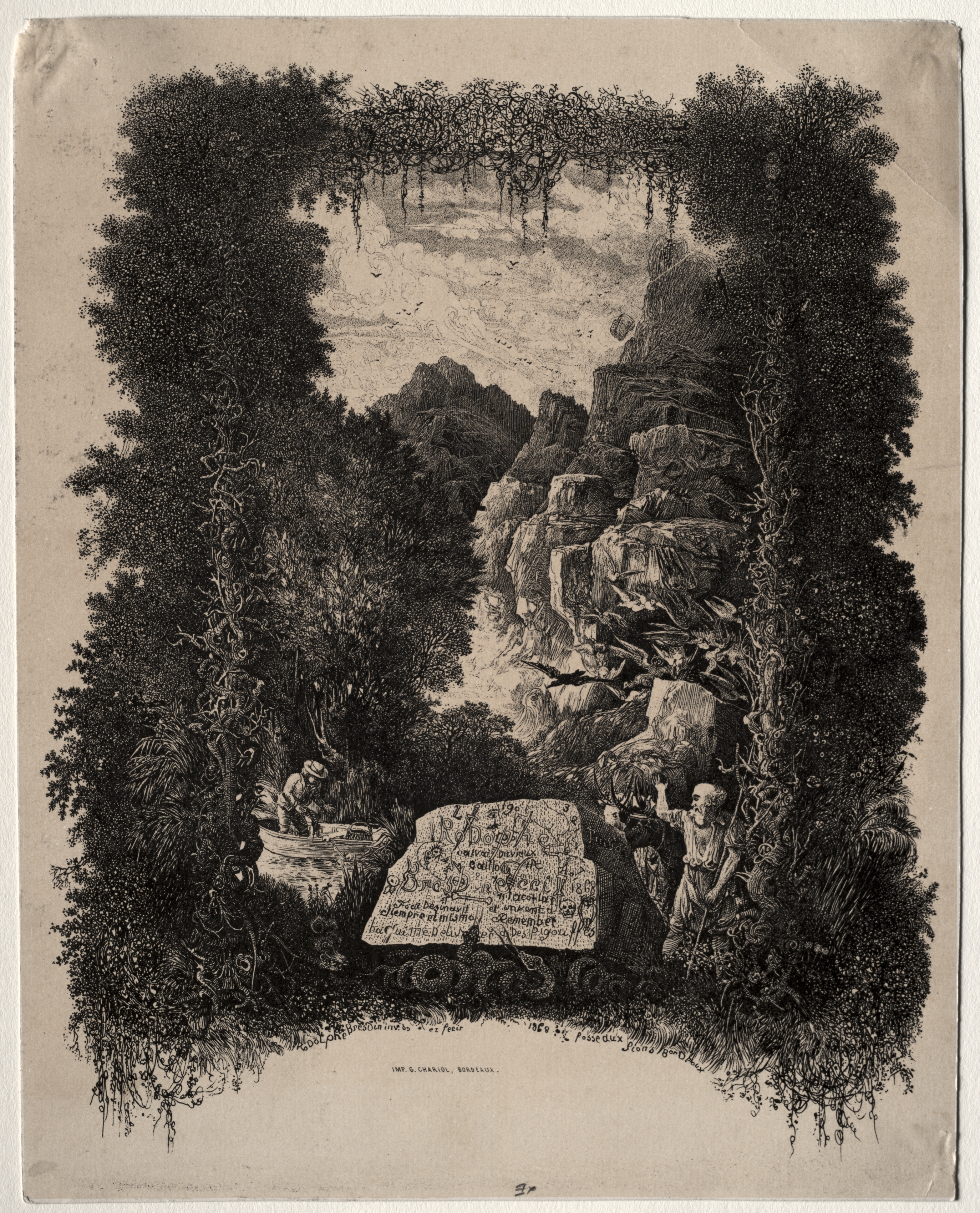 Black and white illustration on beige paper. A rocky cliffside with trees and foliage. A man and a child on right. A man in a boat on left. Large stone slab in center with illegible writing. A forest in background. Sky with clouds and birds. The image is surrounded by a frame of foliage.