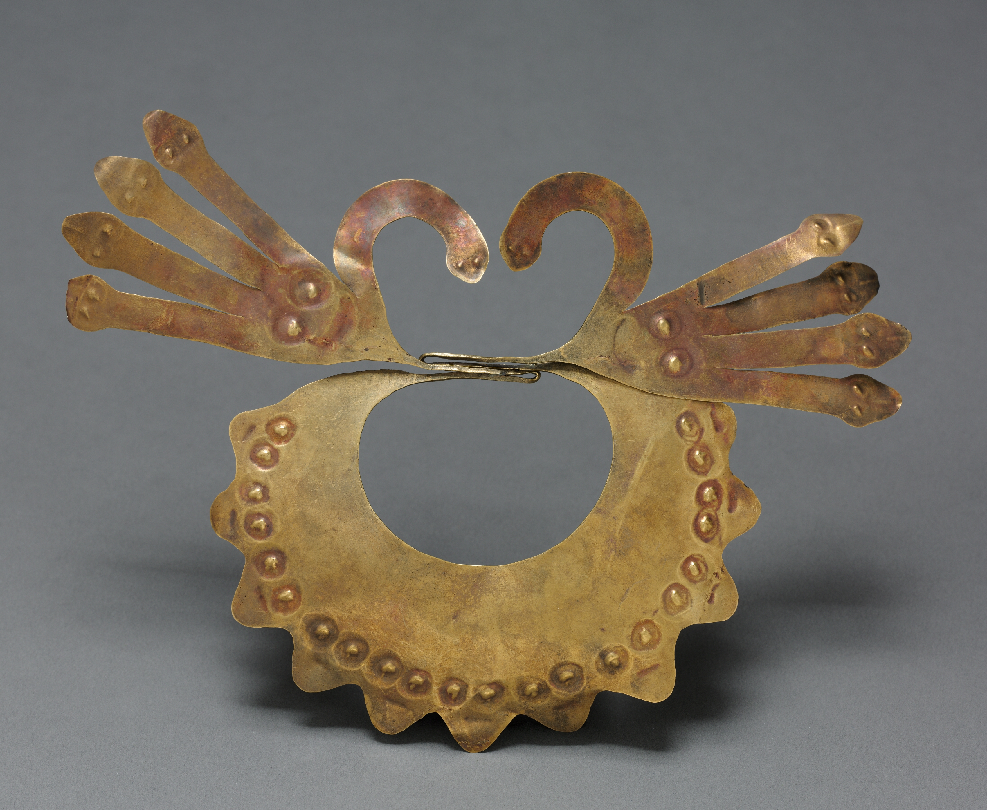 Golden-colored metal mask with a round opening in the center. The mask has a wavy edge at the bottom and two curved protrusions at the top resembling a heart or a swan's neck. There are multiple thin, elongated extensions on either side, each with a rounded tip. The mask features raised dots along its edges and on the extensions. A metal clip or hinge is visible across the top of the round opening. The title of the piece is "Mouth Mask" by an unknown artist.