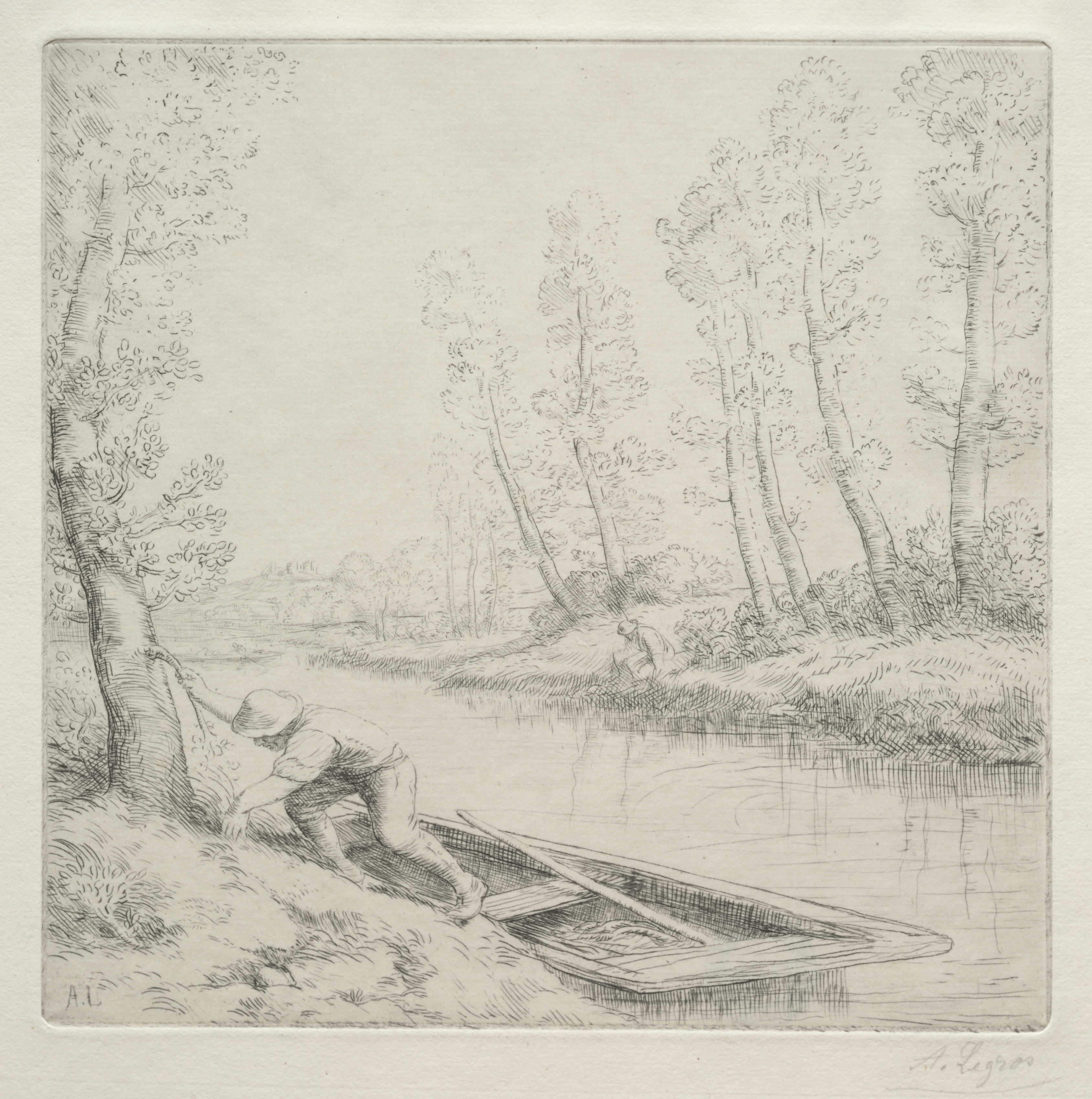 The image depicts a landscape drawing of a river scene. A man wearing a hat, shirt, and pants is pulling a small wooden boat onto the riverbank. The boat has a square section at the back. The man is leaning over, holding a tree with one hand and the boat with the other. He is positioned on the left side of the image. The riverbank has grass and a tree beside the man. There are more trees on the right side of the riverbank. The river reflects the trees. The sky is light and featureless. The drawing is done in black on light-colored paper. The artist's signature is in the bottom-right corner. The title and artist's name appear to be in the context but are not visible on the image.