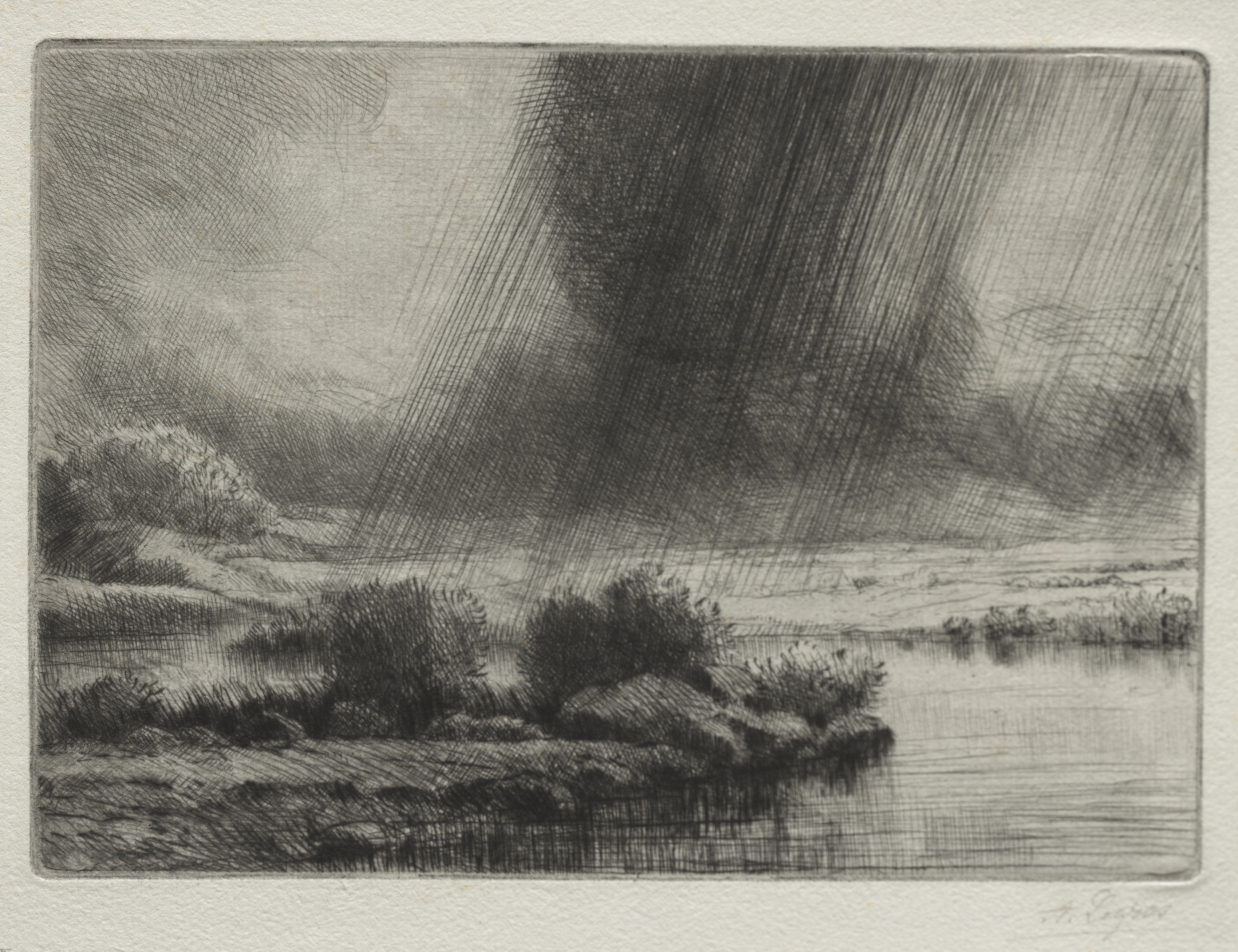 Black and white landscape drawing of a body of water with dark clouds and rain. The drawing depicts a body of water on the right side. Dark clouds take up much of the upper half. Rain falls from the clouds in thick diagonal lines. The rain falls on the right side more heavily than the left. Bushes sit on the left side. The style of the drawing utilizes many fine lines. The artwork sits on a white background. The title is "A Storm" and the artist is Alphonse Legros.