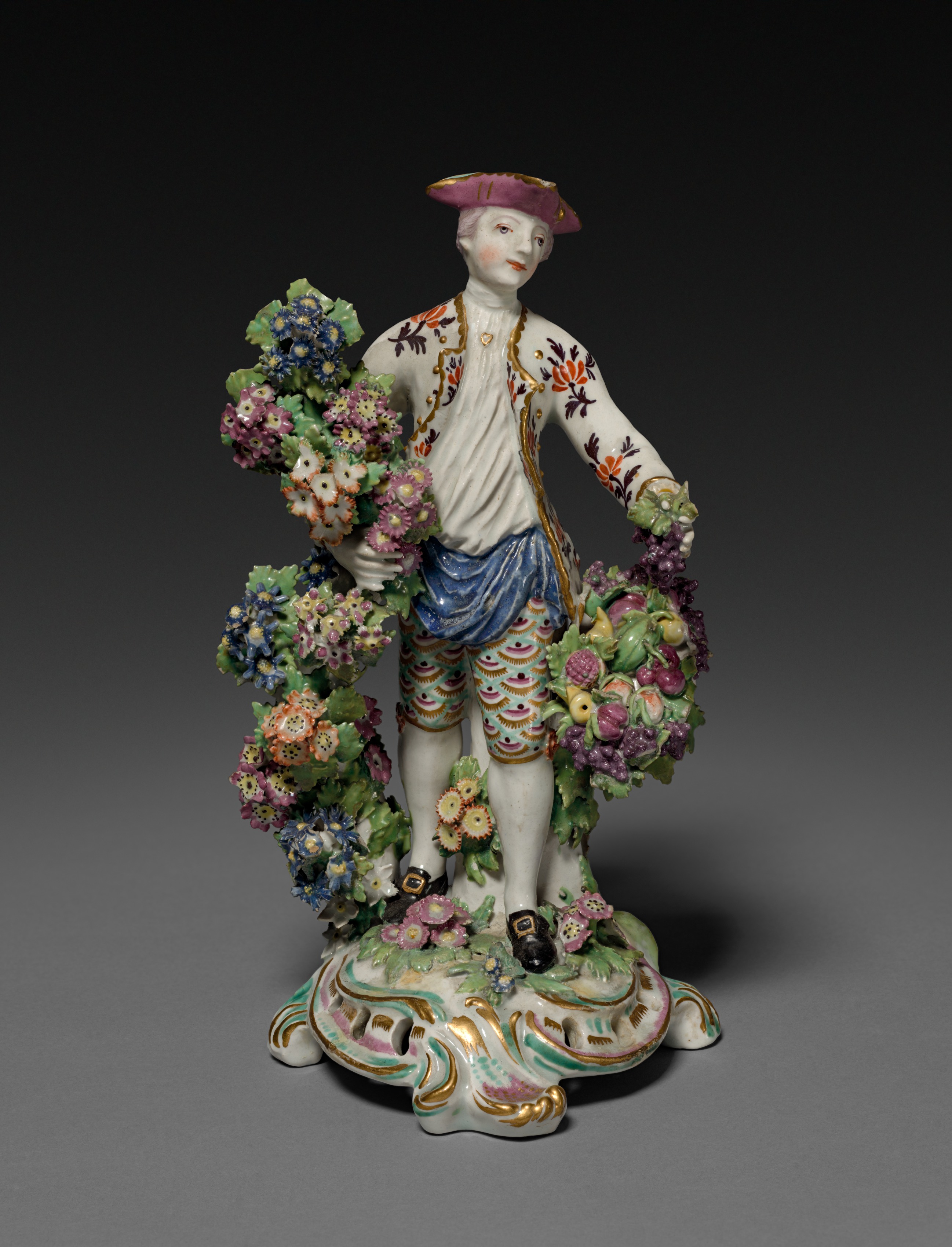 The ceramic figure depicts a male gardener. The figure is predominantly white with floral designs on his jacket and shorts. He wears a pink hat, blue sash, and black shoes. He holds a basket of flowers in one hand and a basket of fruit and vegetables in the other. The figure stands on a base adorned with floral designs. A large floral arrangement is positioned to his left. The background is dark grey. The figure is by Bow Porcelain Factory.