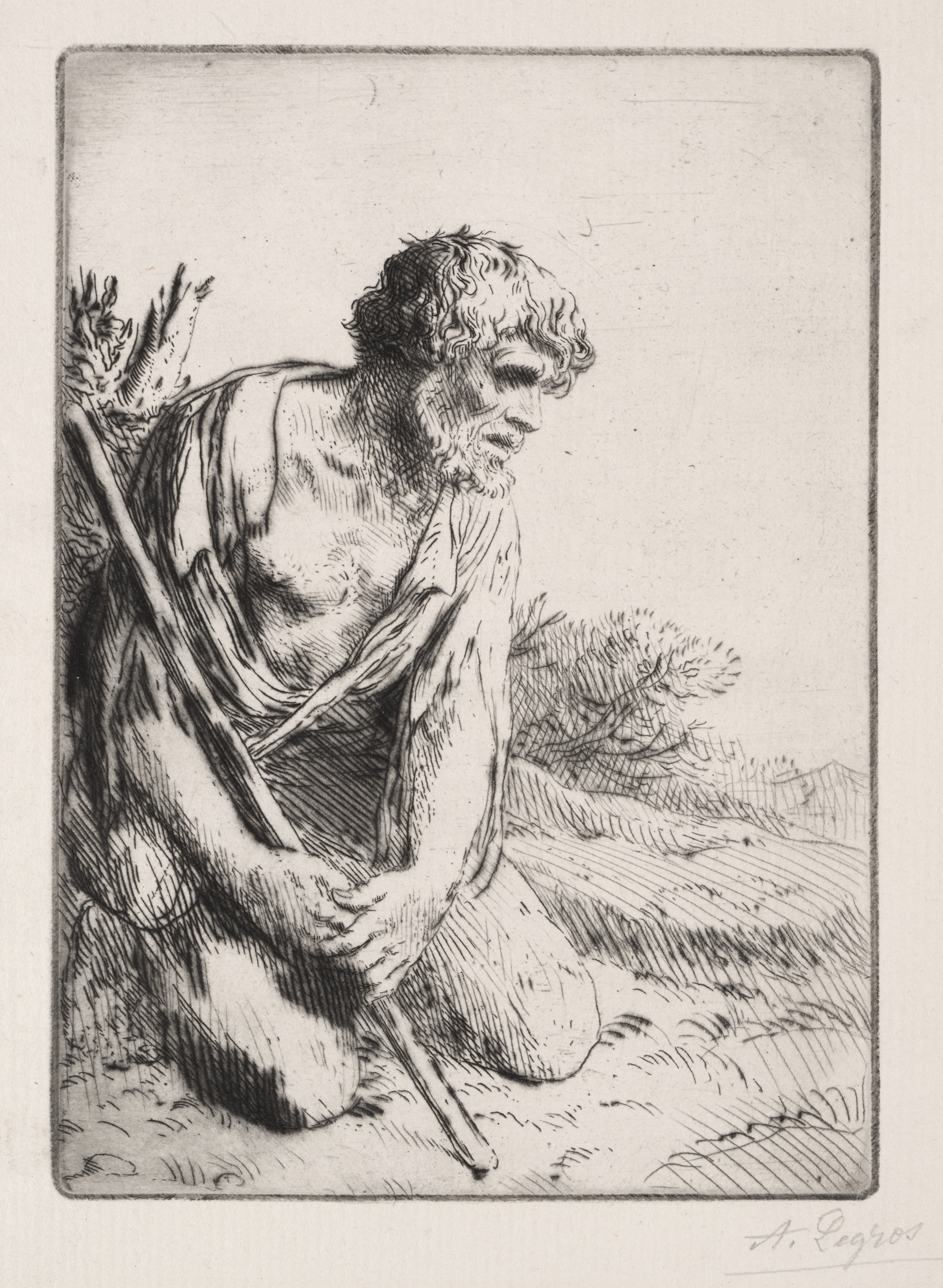 The image shows a black-and-white drawing of a man sitting on the ground in a landscape. The man has curly hair and a beard, and is wearing a cloth wrapped around his body. He is sitting on the ground with his knees bent and his hands clasped around a long stick or staff. The man is holding a bundle of sticks or branches on his back. The background shows a landscape with trees, hills and a clear sky. The drawing is signed in the bottom-right corner. The man is shown in a contemplative pose, with his head bowed and his eyes cast downward.