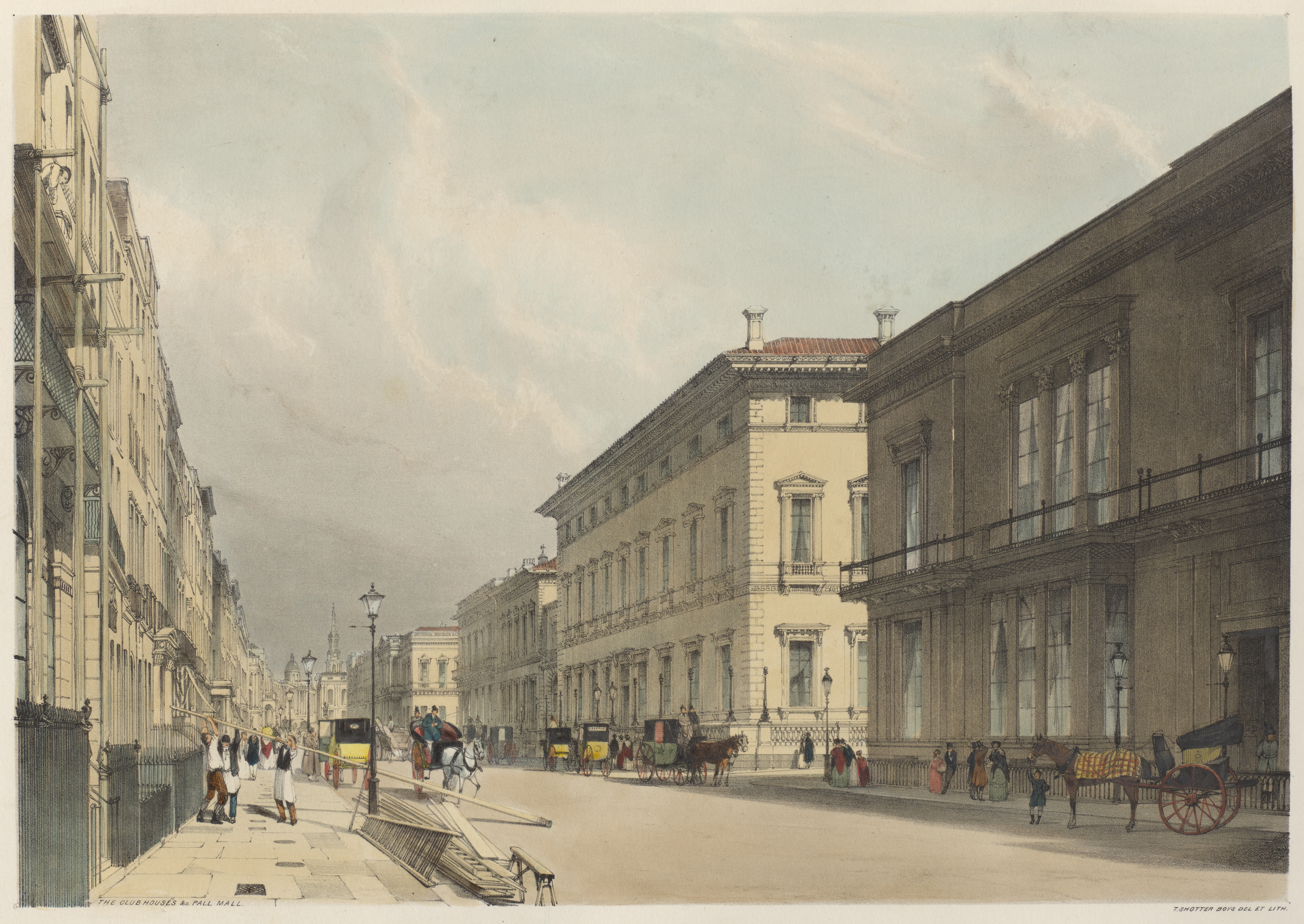 The image depicts a street scene in London. The street runs from the bottom center to the back center of the image, with buildings on either side. The buildings are tan with details including windows, balconies, and chimneys. The buildings on the right and across the street are larger, with the one on the right having a balcony on the second floor. There are horse-drawn carriages and people on the street. The street has a sidewalk with piles of wooden planks on the left. The sky is cloudy and light blue. The scene is labeled as showing club-houses on Pall Mall.