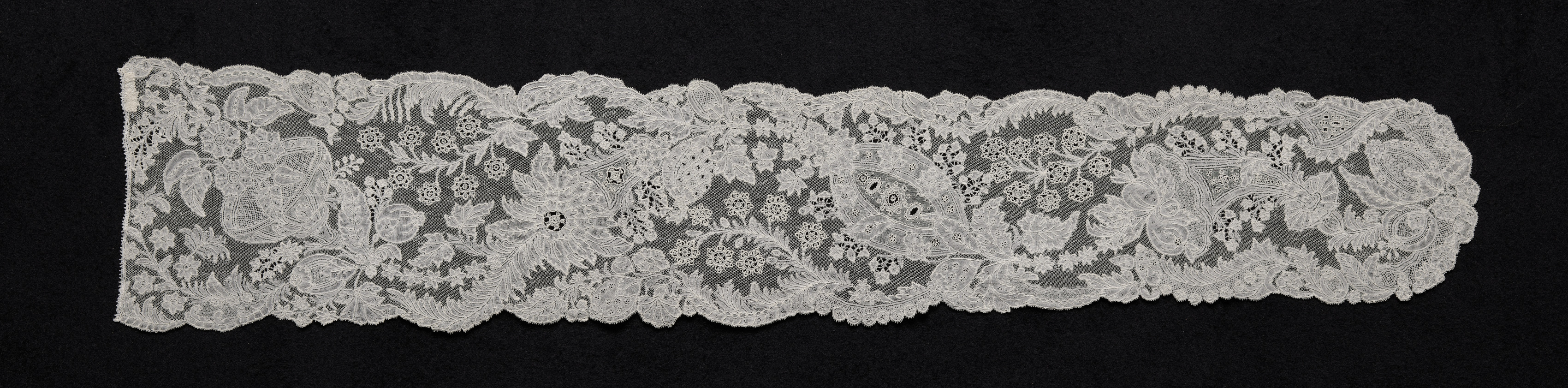 The Bobbin and Needlepoint Lace Lappet by its creator is a long, horizontal piece of white lace against a black background. The lace is intricately designed with floral patterns and leaves. The top and bottom edges of the lace are scalloped. The lace is made up of a repeating pattern of flowers, leaves, and stems. The flowers are of various sizes and are scattered throughout the lace. The leaves are teardrop-shaped and have a pointed tip. The stems are thin and curved. The lace is symmetrical, with the same pattern repeated on both sides of the center. The background is solid black, providing a stark contrast to the white lace.
