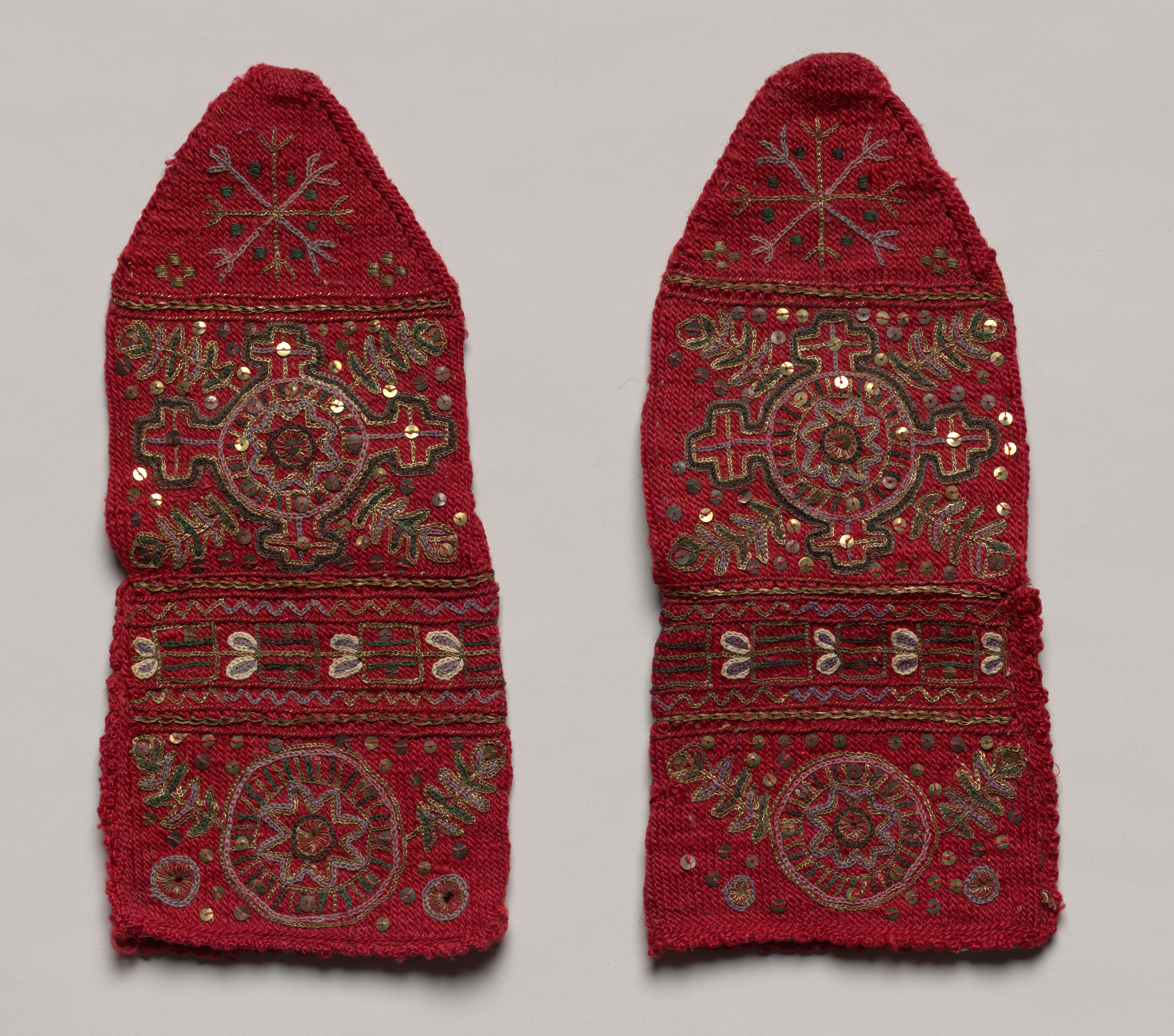 Red, knitted socks with pointed toes. The socks are decorated with intricate, embroidered designs in gold, silver, and dark red thread. The designs include floral patterns, geometric shapes, and other motifs. Small gold sequins are scattered throughout the designs. The socks are shown against a plain gray background. The artist is unknown and the title is "Woman's Bridal Socks".
