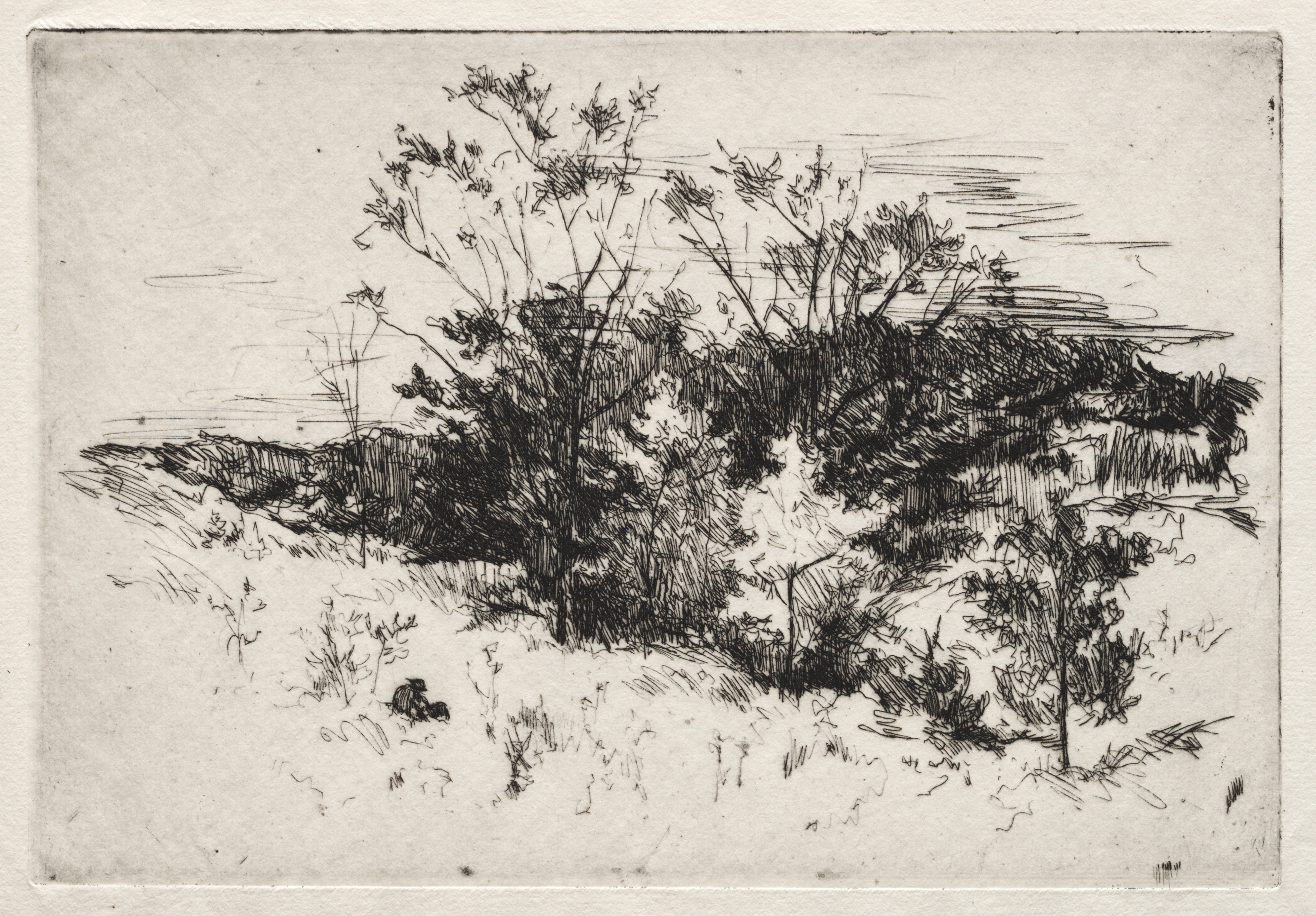 Black and white sketch of a landscape with trees and bushes on a hillside. The trees and bushes are drawn in varying shades of black, with some areas darker than others. The hillside is covered in sparse grasses and small plants. The sky above is light with short, horizontal lines suggesting movement or wind. The artwork is set against a light-colored background with a darker border around the edges. The style is highly detailed and realistic. "Autumn Landscape" by John Henry Twachtman.