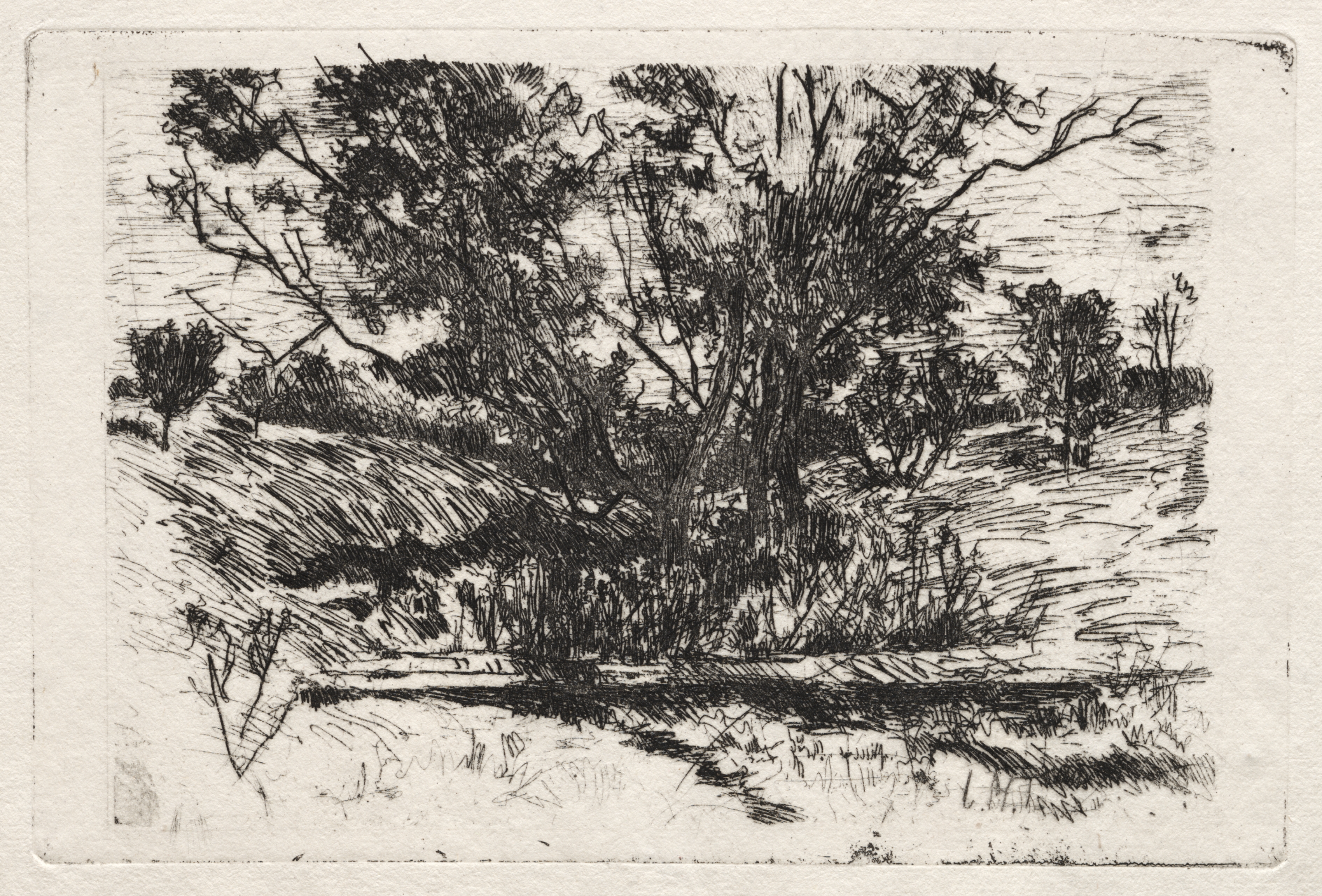 Black and white landscape drawing of a tree and other vegetation near a body of water. The tree is positioned centrally with a wide, short trunk and many branches extending upwards and outwards. The tree and other vegetation are drawn with dense, dark shading. The body of water appears to be shallow with slanted lines indicating movement or ripples on the surface. The background features additional vegetation and possibly a hill or elevated area on the left side. The overall style of the drawing is impressionistic with expressive, hatched lines. The title of the drawing is "Landscape near Cincinnati" and the artist is John Henry Twachtman.