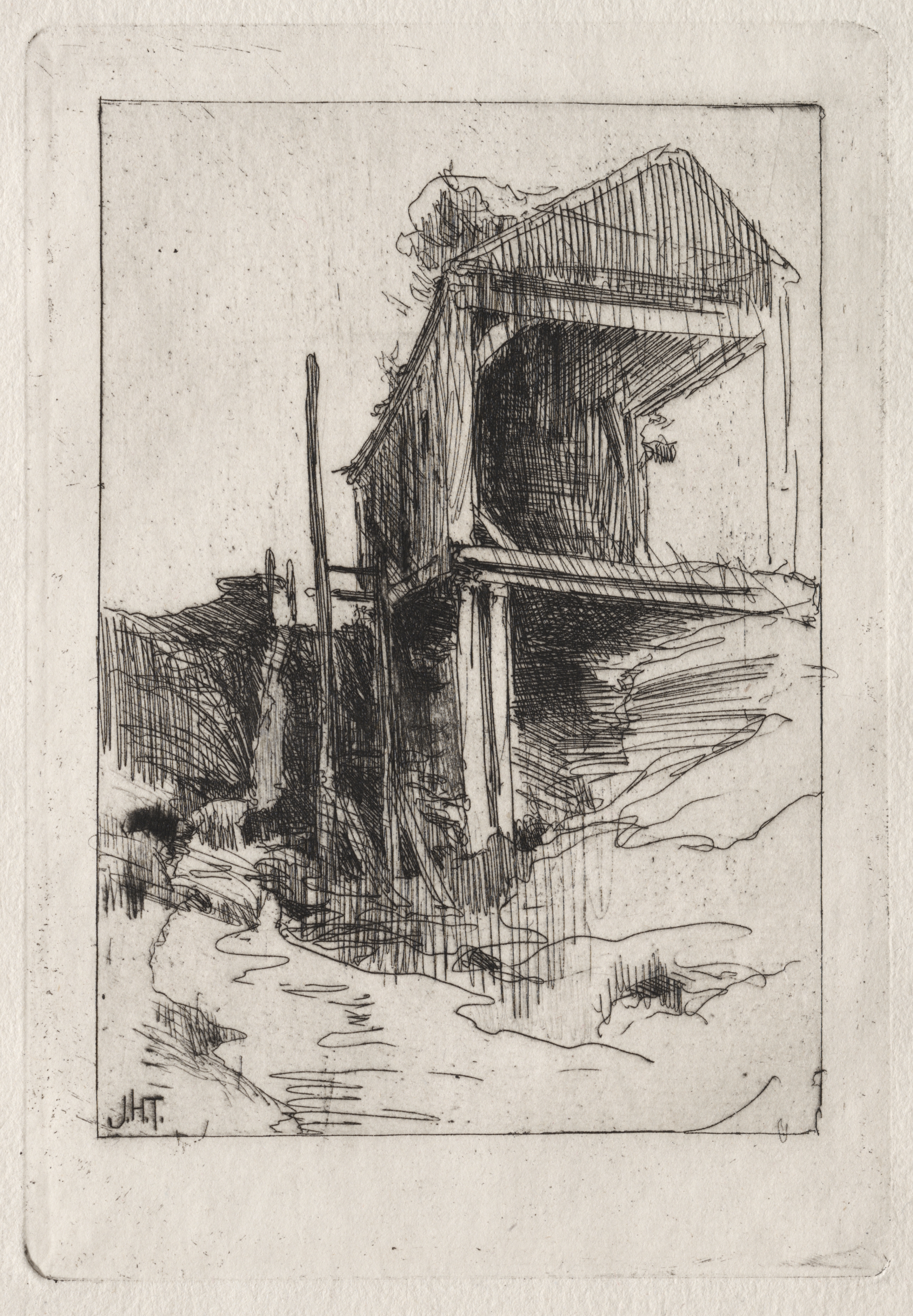 Black and white sketch of a mill. The mill is on the right side of the image. It has a slanted roof and a small overhang supported by pillars. The roof of the overhang is slanted. There are lines on the right side of the overhang suggesting windows or openings. A short wooden fence runs along the left side. The background shows a flat field or yard with some sparse grass. The image has a thin black border around it and is on a light background. The artist's initials "J.H.T." are in the bottom-left corner.