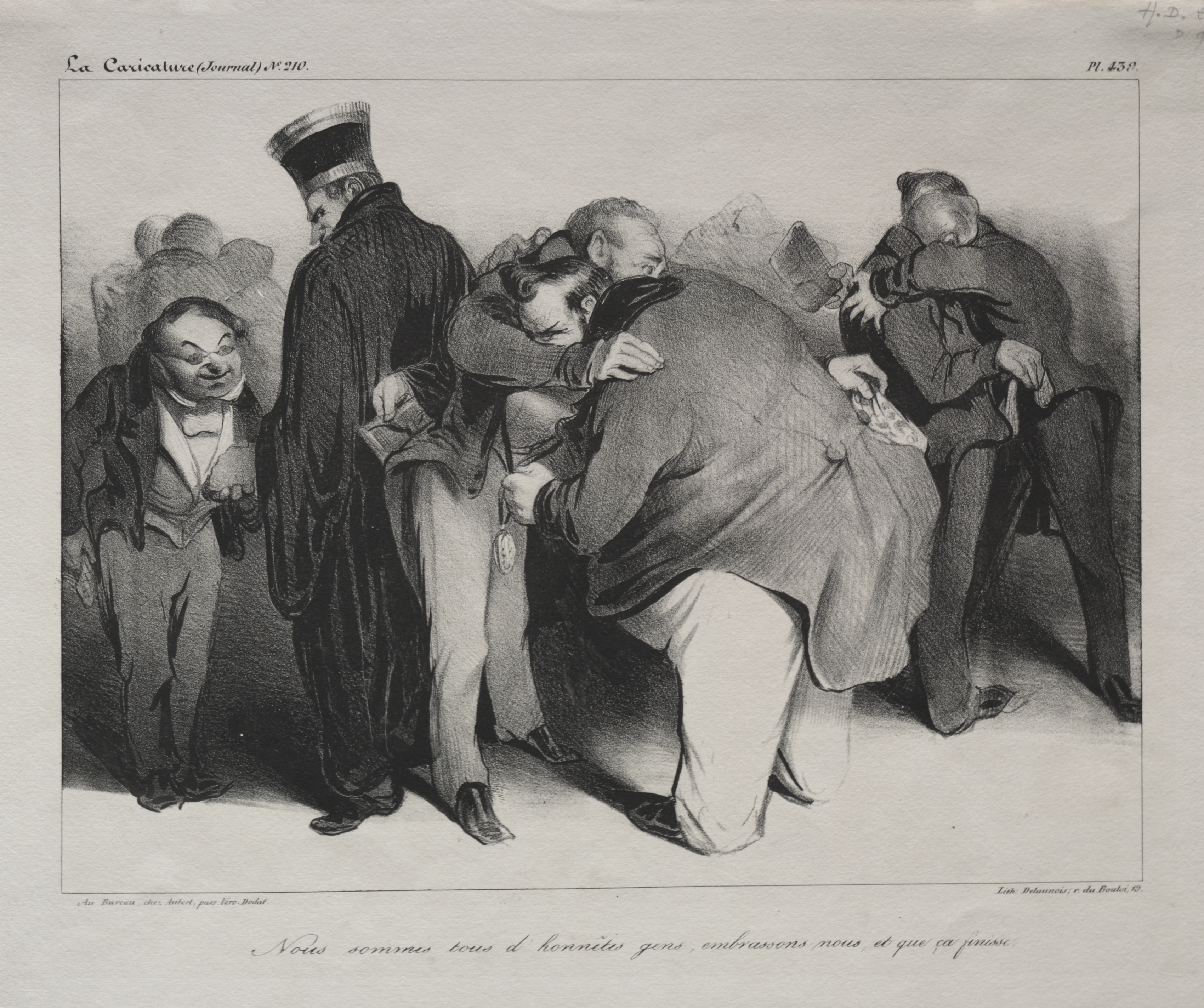 Black and white drawing of five men in 19th-century clothing embracing. The man on the left wears a suit with a bow tie. The man standing second from the left wears a military-style uniform. The central figures are embracing, one with a coat. The man on the far right sits on a chair, embracing another. The background features a wall or backdrop. The men are depicted in a group hug. The image includes a border and text at the top and bottom.