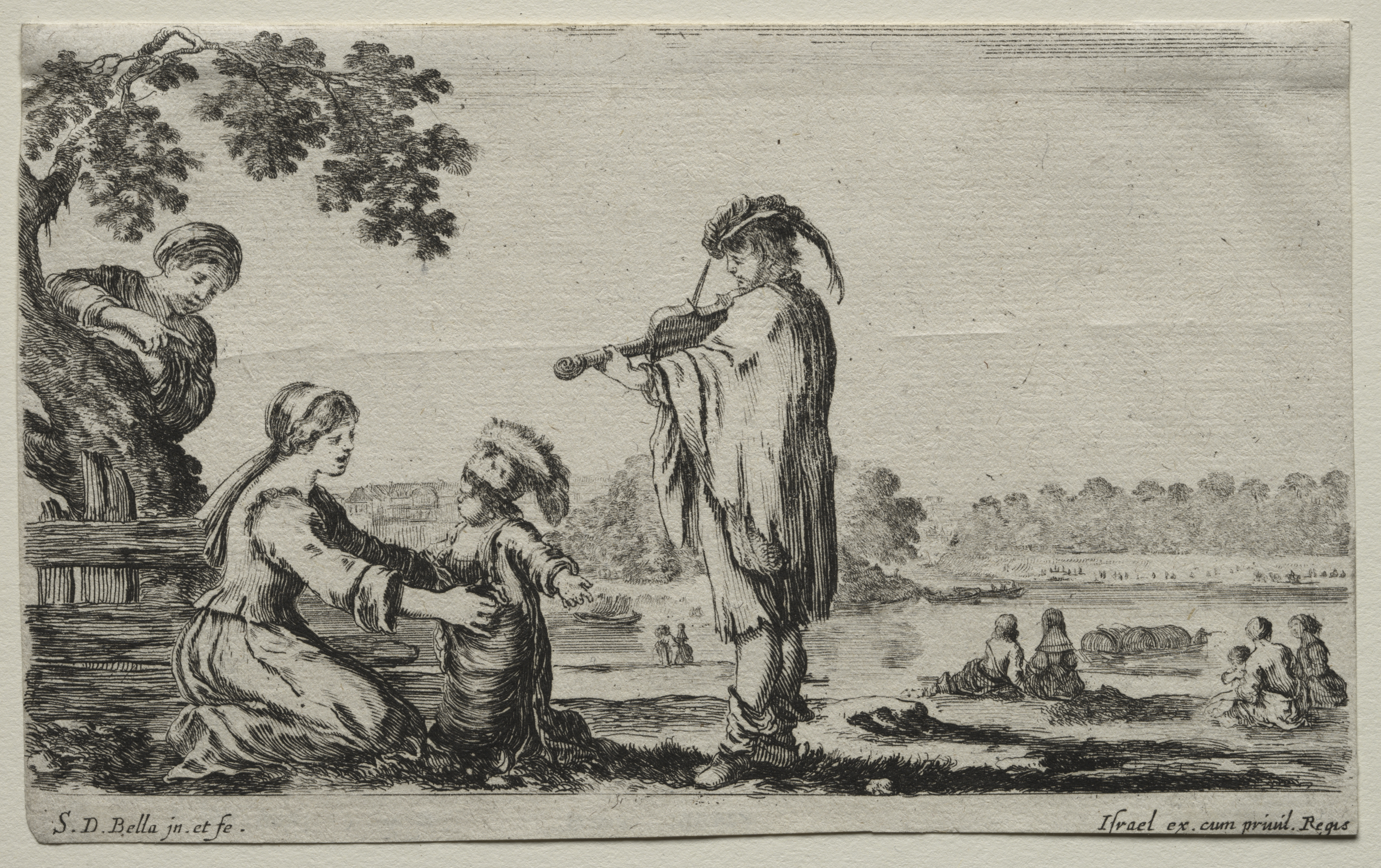 Black and white etching on textured paper, depicting a landscape with a body of water and trees in the background. A man stands on the right, wearing a hat with feathers and a long robe, holding a horn. A woman and a child are on the left; the woman kneels and holds out her hand to the child. On the far left, a man sits on a ledge under a tree. On the far right, three people sit on the ground, watching the scene. The sky above is clear. The etching is signed "S.D.Bella jun.et fe" in the bottom-left corner and "Israel ex.cum privil.Regis" in the bottom-right corner.