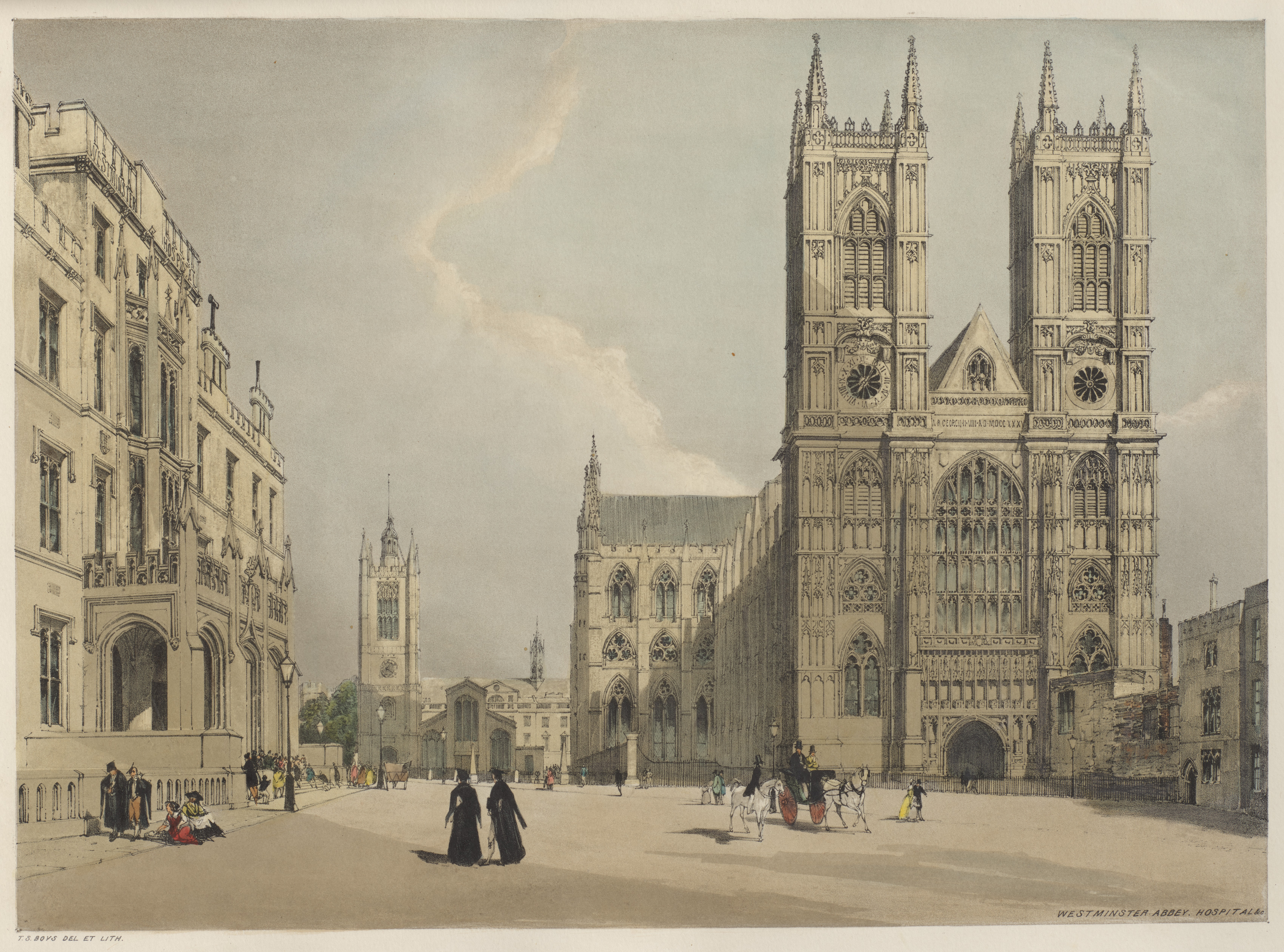 Large Gothic building with two tall towers on right, many small windows and arched doorways; people in old-fashioned dress walk around square in front. A horse-drawn carriage. Buildings on left. Light-colored sky with some clouds.