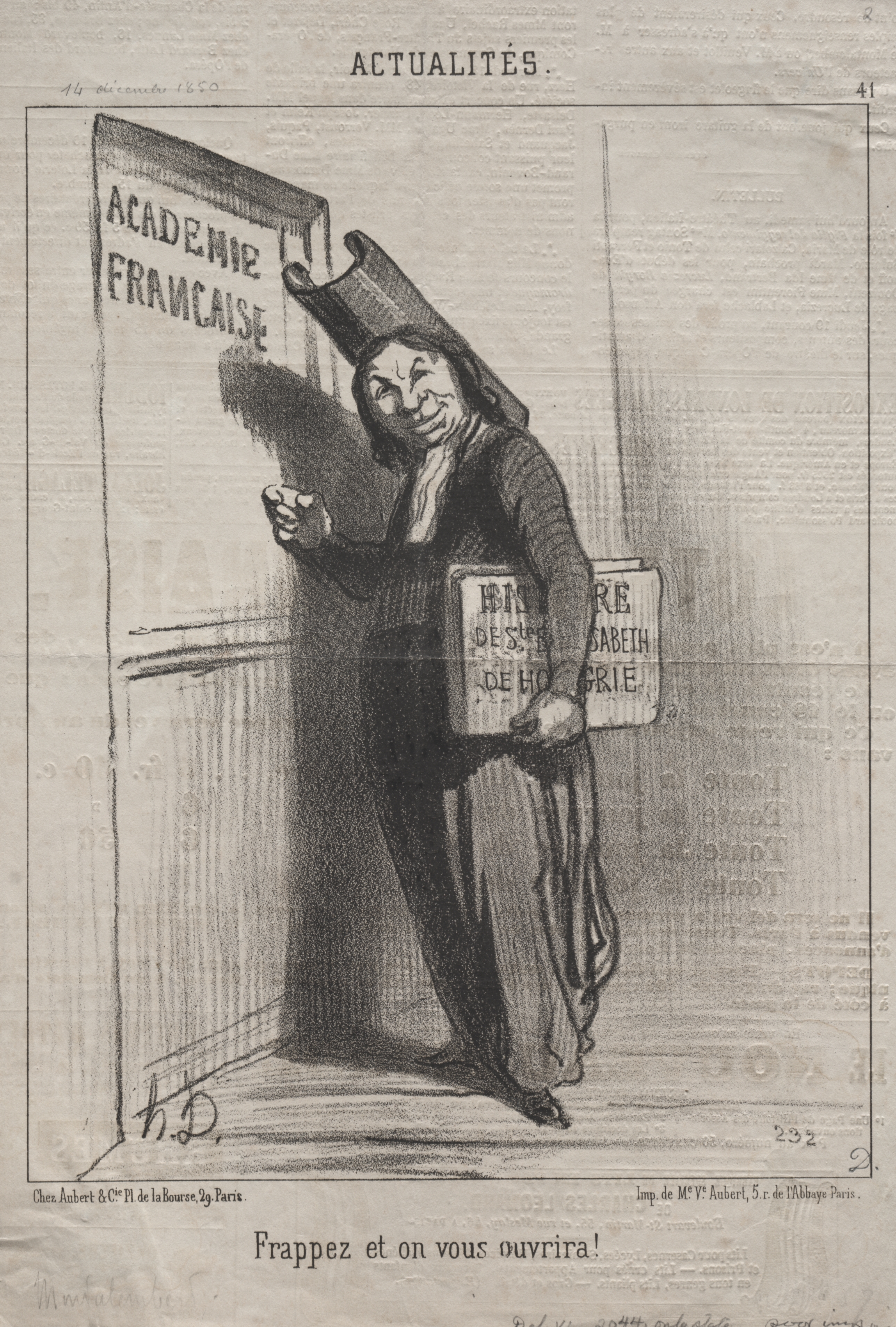 Black and white drawing of a man knocking on a door. The man wears a top hat, a suit jacket with tails, a dress shirt and long pants. The man carries a cane in his right hand and a placard in his left hand. The man's face is long, thin and gaunt. The door reads 'ACADEMIE FRANCAISE'. The man holds a small mallet in his right hand. A placard on the man's chest reads 'MME GEORGE SAND ELISABETH DEHORGIE'. The image contains French text.