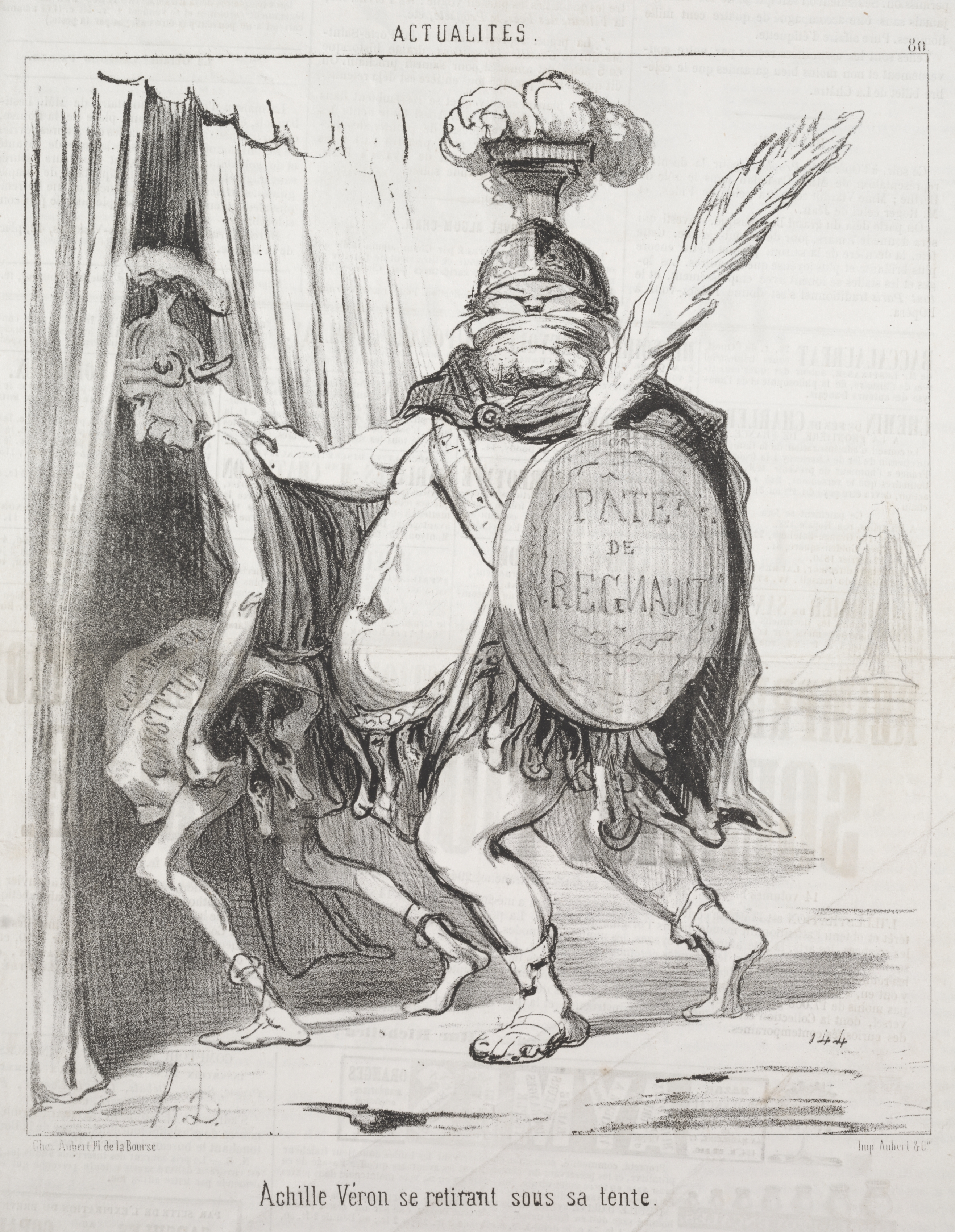 Black and white drawing of a rotund man in a helmet and cape with a shield and a torch on his head. The man has a large belly and is barefoot. He holds a round shield with "PATE DE REGNAUD" written on it. He appears to be entering a tent or behind curtains. He is depicted with feathers on his cape and a cloth wrapped around his face. The image includes text at the top that reads "ACTUALITES" and at the bottom "Achille Veron se retirant sous sa tente". The background shows a faint image of a pyramid.