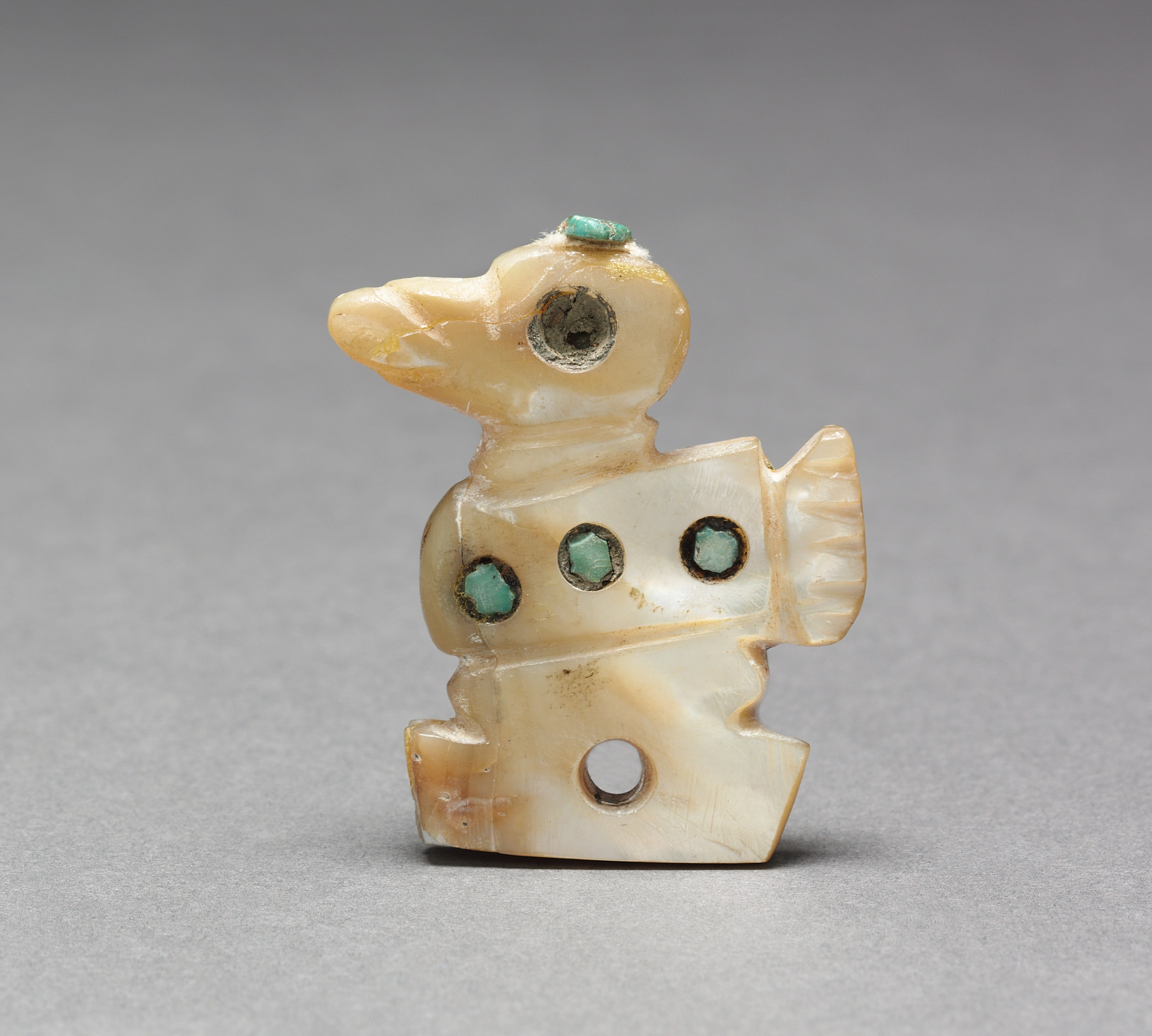 Bird Ornament by Unknown. The object is a small, carved bird figurine. The bird has a long beak and a small head. The body of the bird is made of a light-colored stone or material, possibly ivory or jade. It has a smooth, glossy finish. There are three circular holes on the body of the bird, each containing a small, square turquoise stone. The bird has a small circular hole on the top of its head and a larger circular hole on its belly. The tail of the bird is carved with lines to resemble feathers. The bird is sitting on a flat surface, with its legs not visible. The background of the image is a plain gray color.